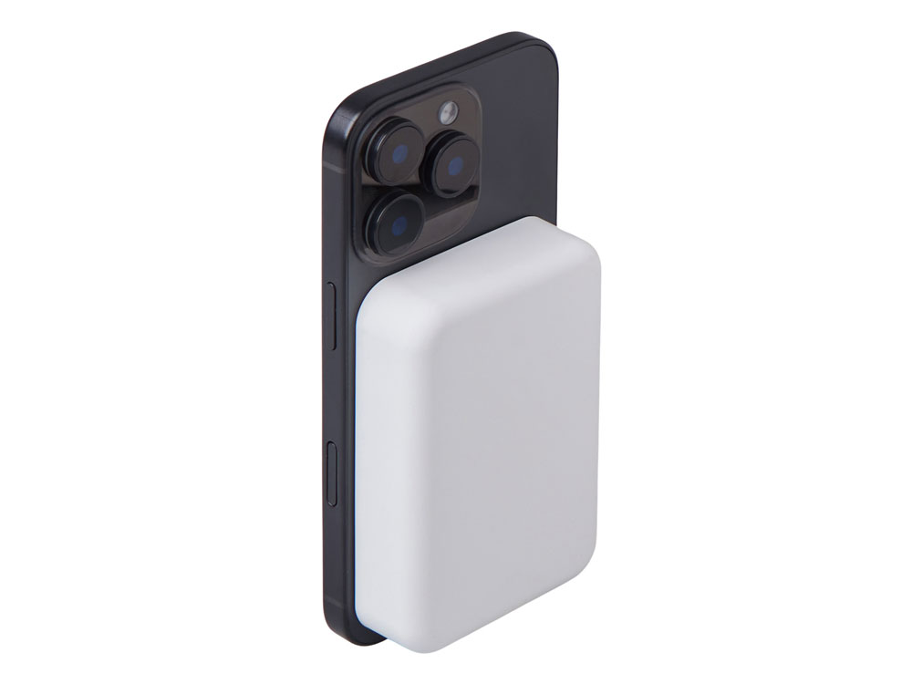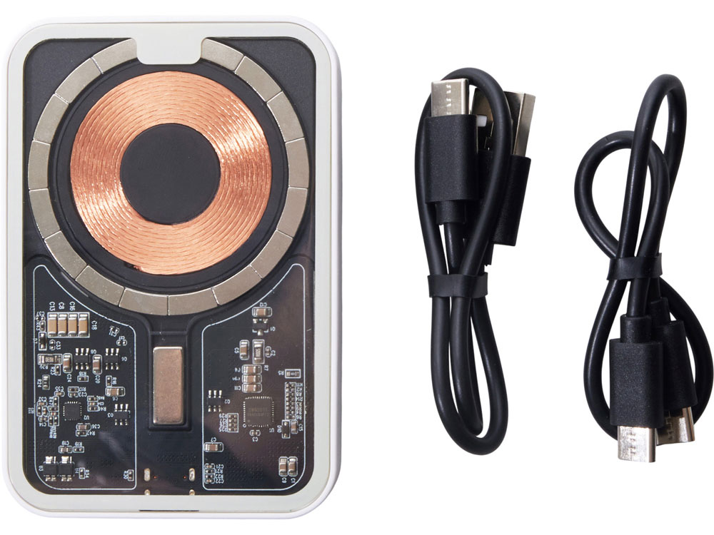 Беспроводной магнитный внешний аккумулятор MagnifIQ — технологичный и стильный power bank с эффектной прозрачной передней панелью, сквозь которую видны мощные магниты, индукционная катушка и электронная начинка. Ёмкость 10 000 мА·ч обеспечивает до 2–3 полных зарядов смартфона, а поддержка быстрой беспроводной зарядки до 15 Вт (с совместимостью QC/PD) делает процесс зарядки максимально быстрым и удобным. Двунаправленный USB-C порт позволяет как заряжать другие устройства, так и сам аккумулятор. Обе стороны корпуса подходят для нанесения логотипа: лицевая — через прозрачную панель, задняя — на приятное на ощупь soft-touch покрытие. Компактный, надёжный и сильный — идеальный технологичный продукт для продвижения и ежедневного использования. Поставляется в качественной упаковке с шубером, Двунаправленный кабель USB-C и кабель USB-A – USB-C в комплекте. • Прозрачная передняя панель — демонстрирует внутреннюю начинку и подчеркивает технологичность бренда. • Магнитная беспроводная зарядка 15 Вт • Ёмкость 10 000 мА·ч — хватает на несколько полных зарядов смартфона. • Двунаправленный USB-C — универсальность для зарядки и подзарядки. • Две зоны нанесения логотипа: на прозрачную панель спереди и на soft-touch покрытие сзади. • Сильные магниты обеспечивают надёжную фиксацию на совместимых устройствах.