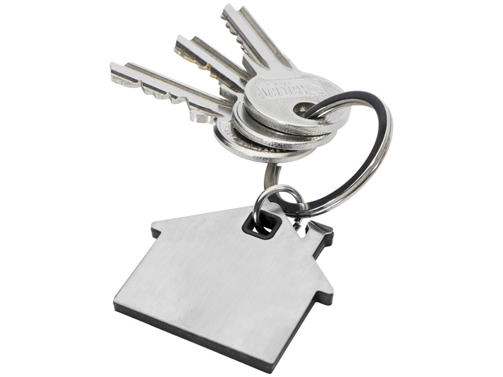 Брелок для ключей в форме домика с цветной вставкой из пластика между 2-мя серебристыми пластинами из стали.