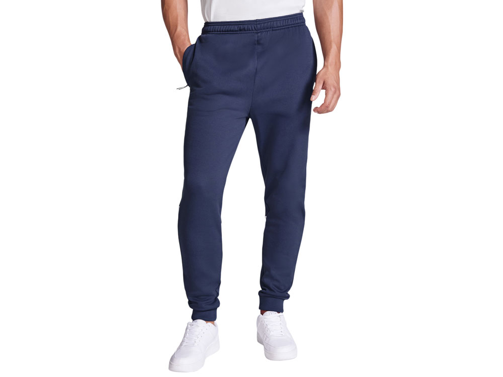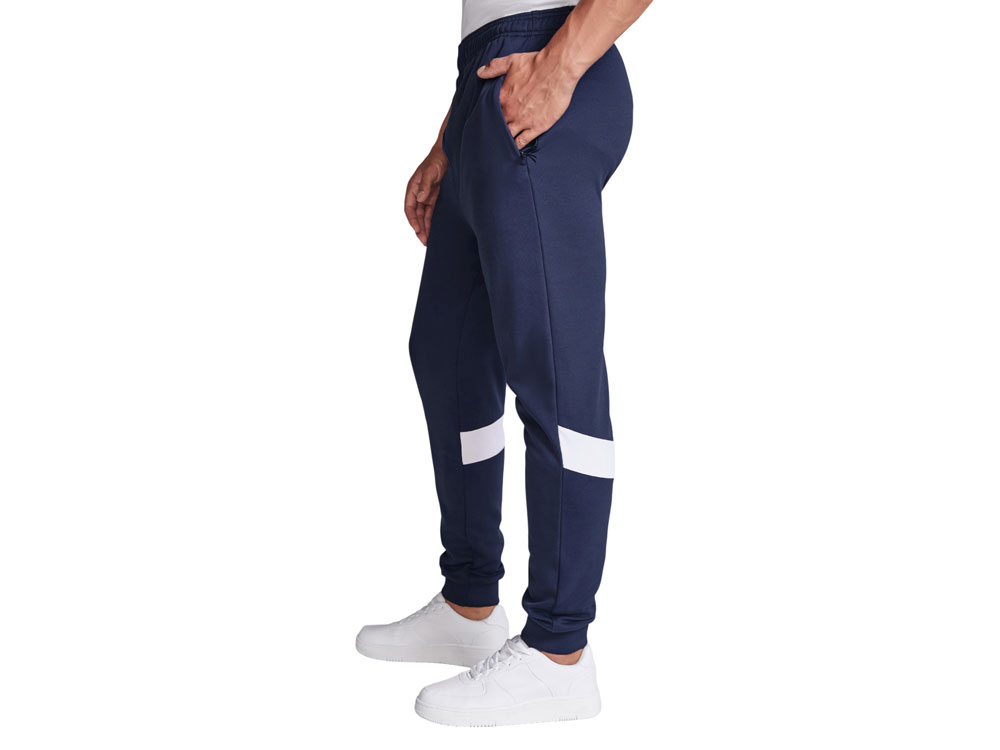 Спортивные брюки с эластичным поясом и шнурком. Боковые карманы закрываются на молнию. Контрастные лампасы белого цвета. Низ с манжетами из риба 1х1. Может быть с комбинирован с курткой Leros.