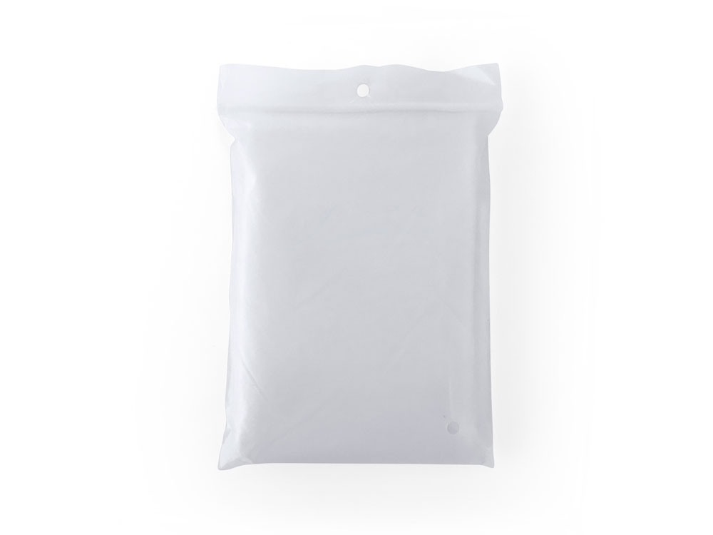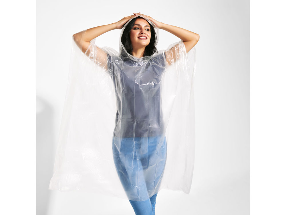 Прозрачный дождевик из компостируемого материала. Единый размер для взрослых с капюшоном и отверстиями для рук. Поставляется в мешочке из PLA 10 x 13,5 см.