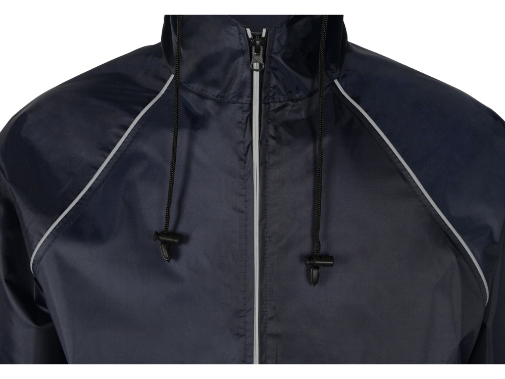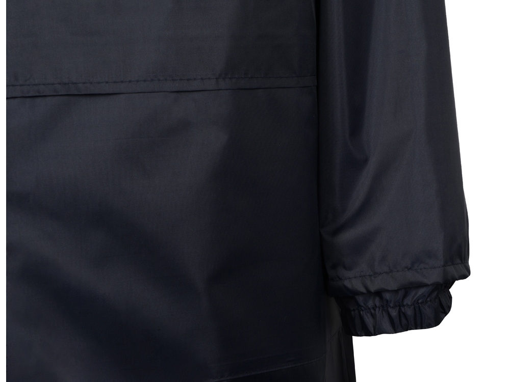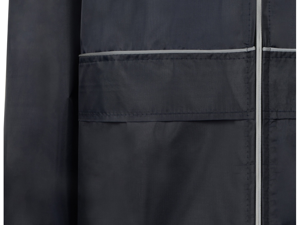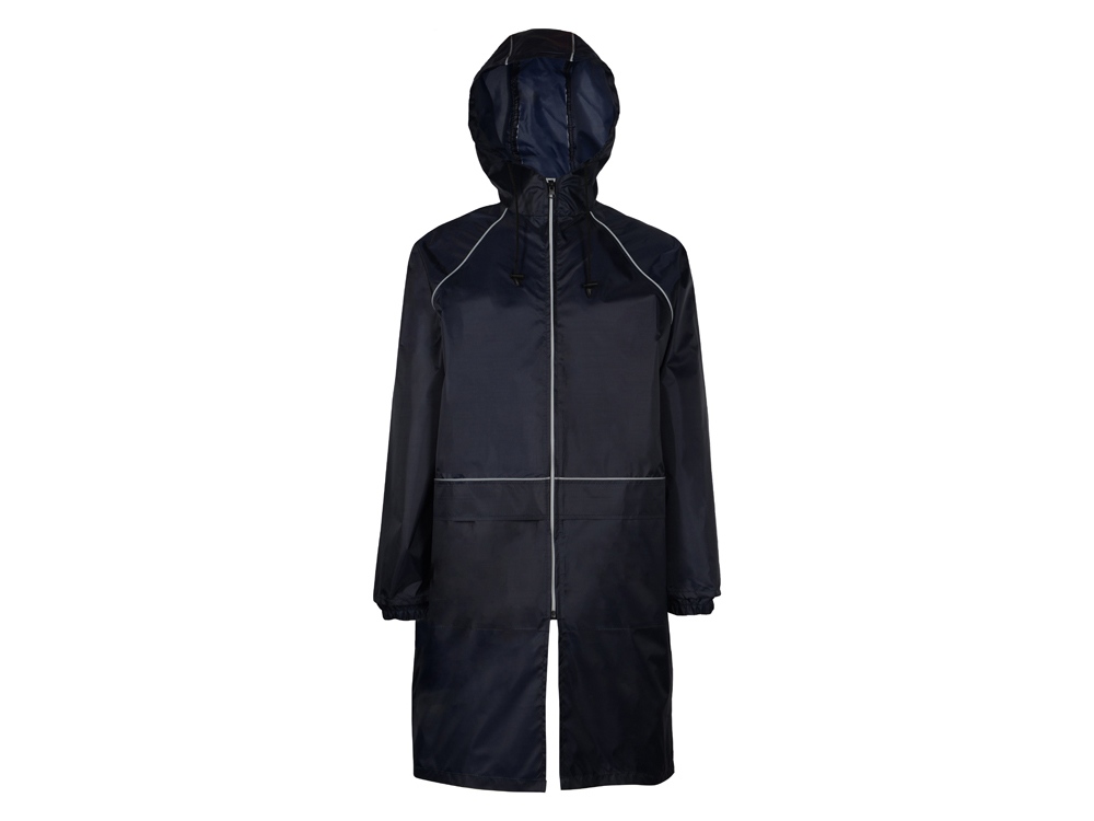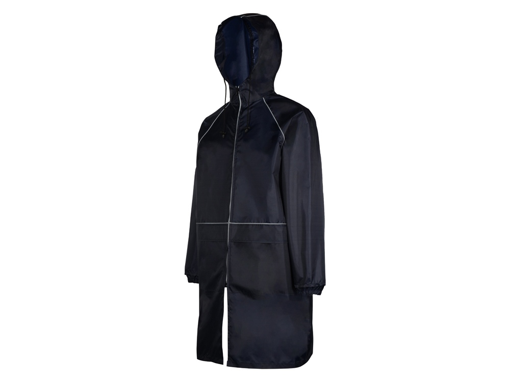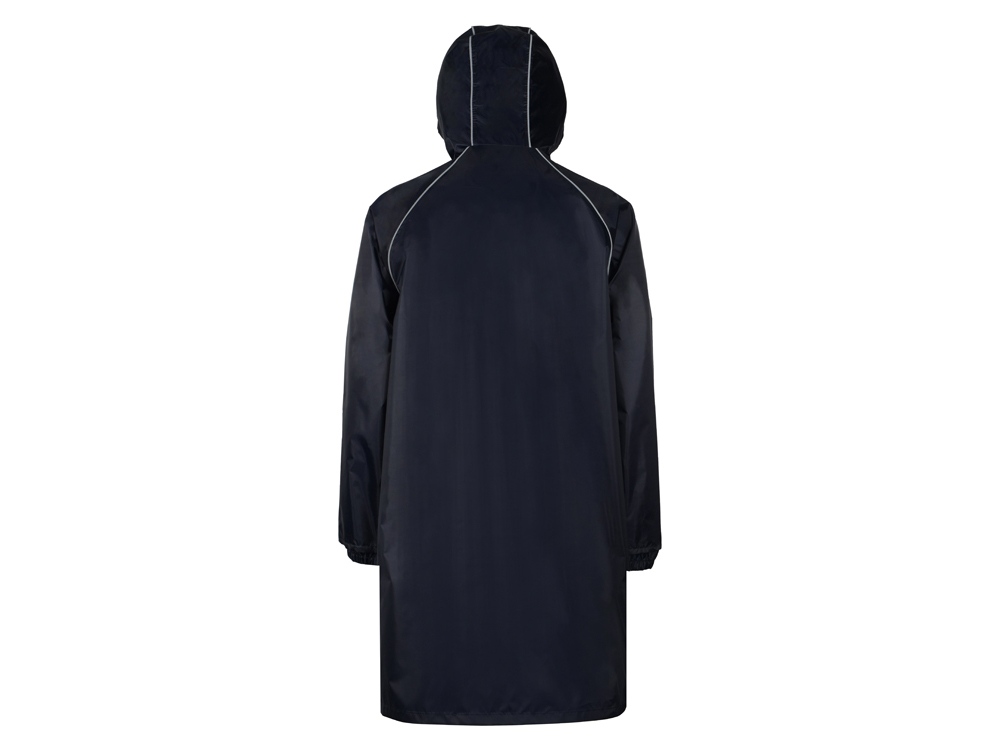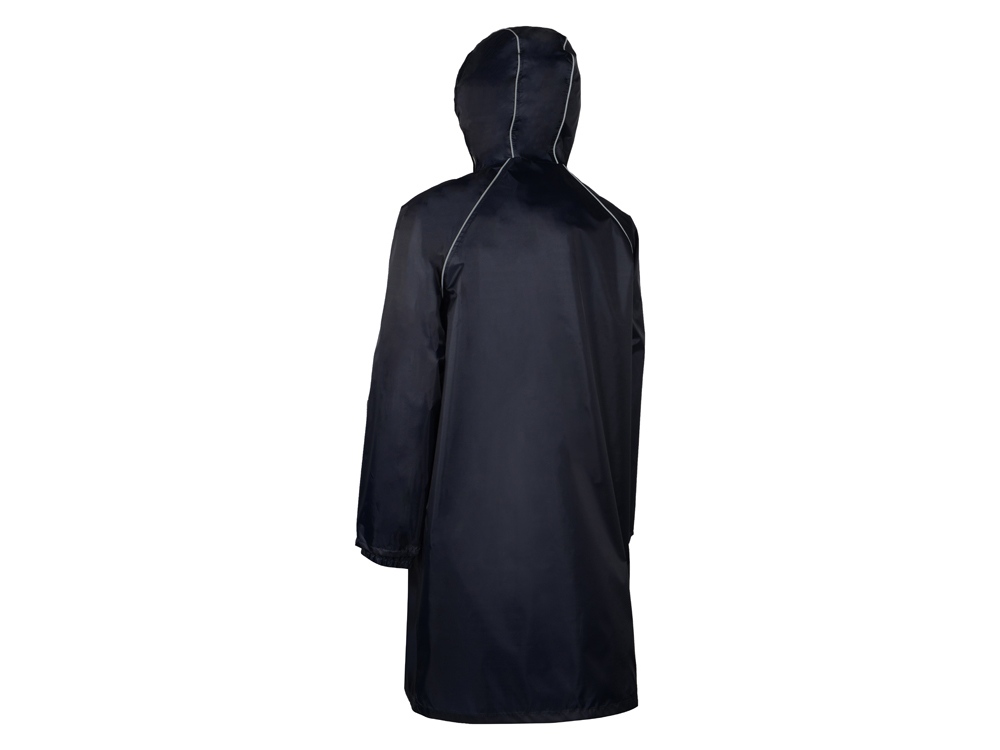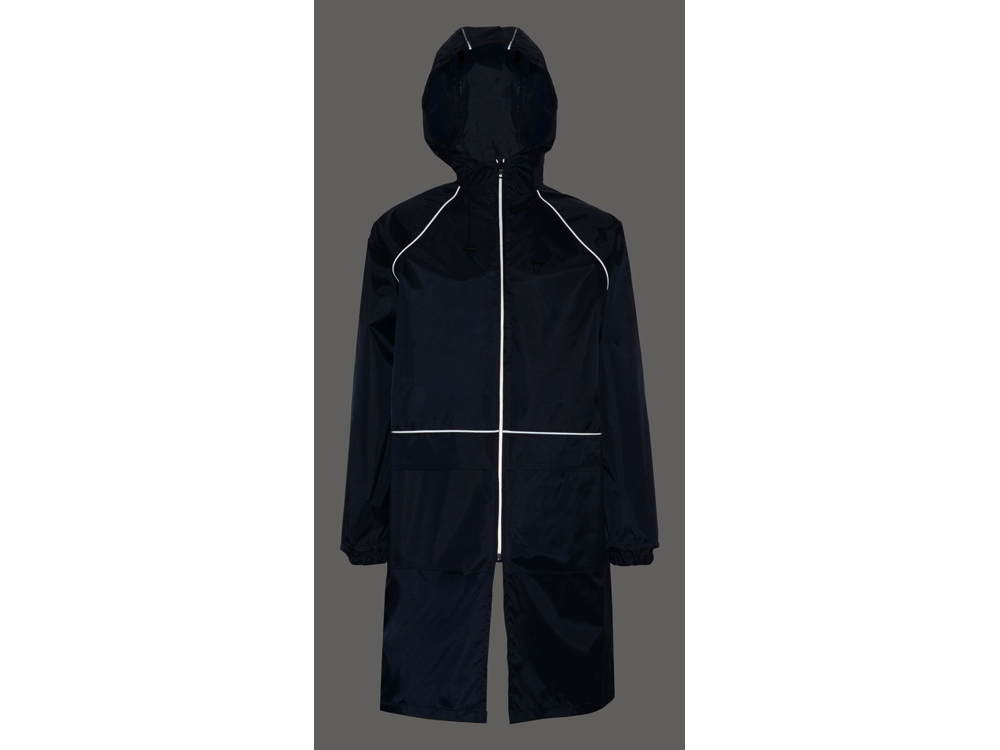 Плащ-дождевик прямого силуэта с капюшоном и рукавом реглан. Застегивается на центральную молнию со светоотражающей полосой с внутренней ветрозащитной планкой. Накладные карманами с клапанами. Двухшовный капюшон с кулиской по краю. Низ рукавов обработан манжетами с внутренней резинкой для комфортной посадке в области запястья. Верхний край клапана кармана, швы капюшона, а также регланные линии обработаны светоотражающим кантом. Поставляется в чехле-мешочке на шнурке для компактного хранения.