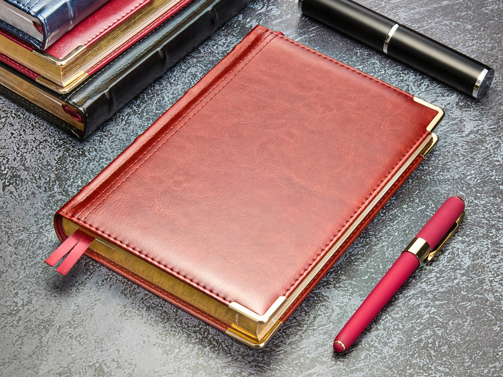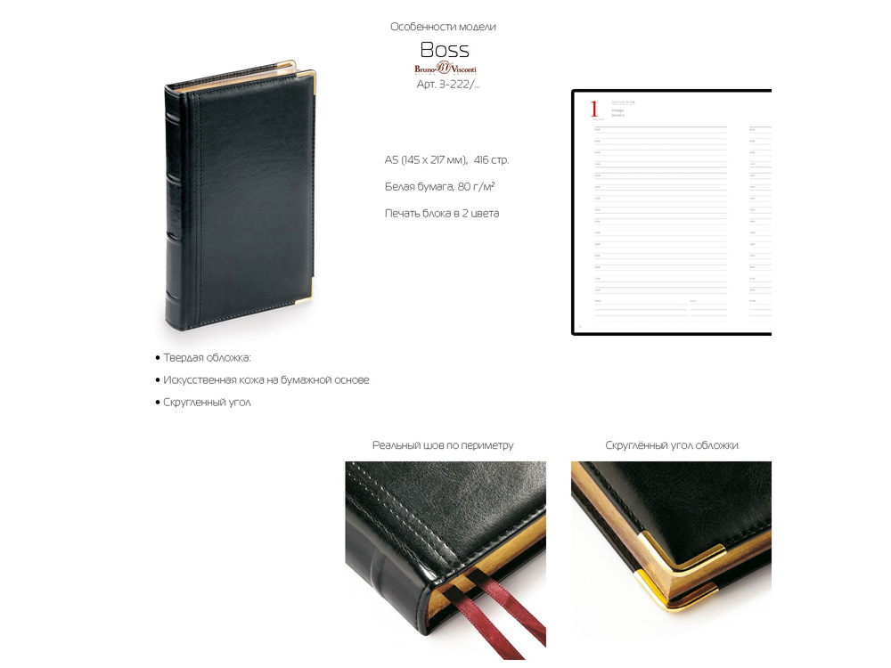 Полудатированный ежедневник Boss от бренда Bruno Visconti - это качественный корпоративный подарок по выгодной цене, произведенный специально под персонализацию. Представлен в универсальном формате А5 и состоит из 416 страниц. Классический деловой ежедневник линии Boss – образец элегантности. Гладкую тонкую фактуру экокожи подчеркивает декоративная строчка по контуру и металлические закругленные уголки золотистого цвета. В ежедневнике есть полезная справочная информация и телефонная книга, а также страницы для записи идей, мыслей и составления рабочих планов. Есть перфорация (нижние уголки отрывные). Для изготовления страниц используется качественный бежевый офсет повышенной плотности (80 г/кв м), которая производится японской фирмой Daiwa и подходит для всех видов чернил. Ежедневник можно персонализировать с помощью тиснения обложки - золотой или серебряной фольгой. Наши ежедневники помогут быть успешным и эффективным в карьере и повседневной жизни!