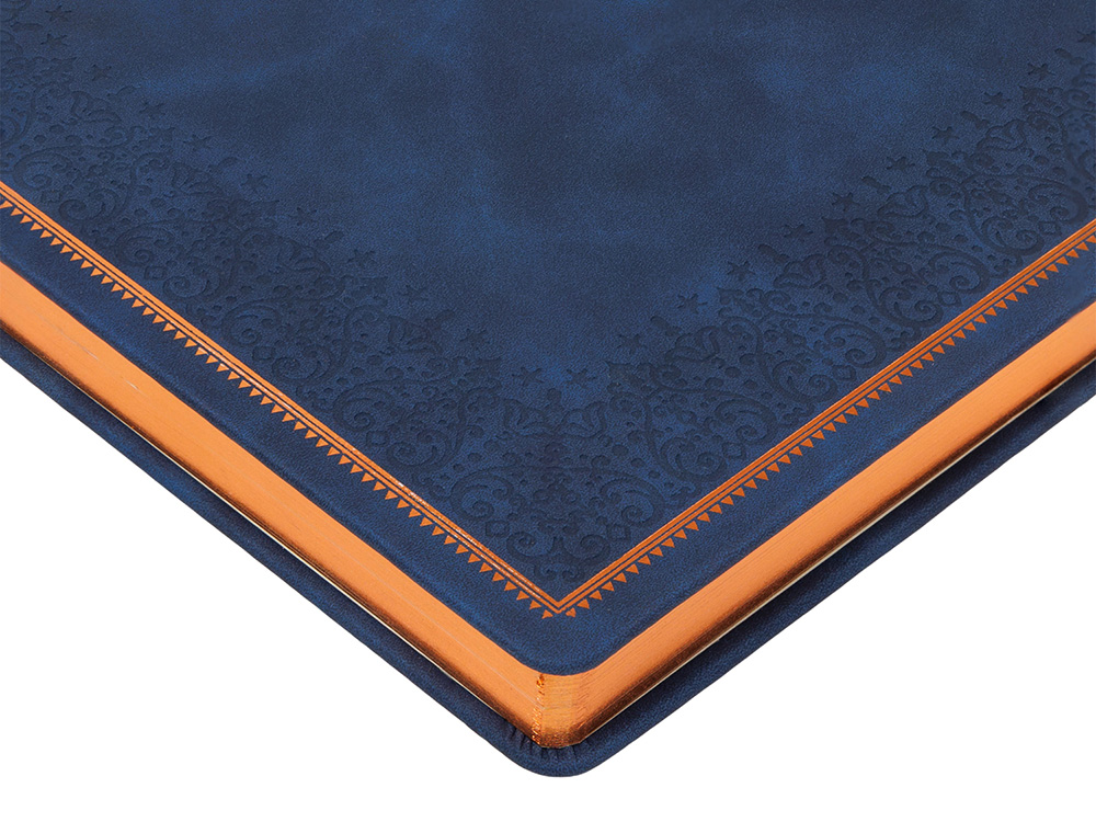 Недатированный ежедневник Royal формата А4 с твердой обложкой из искусственной кожи с имитацией нубука украшен художественным бронзовым и блинтовым тиснением. Внутри 192 страницы, выполненные из качественной бежевой бумаги в линейку плотностью 140 г/м². Два шелковых ляссе в цвет обреза блока и обложки облегчают навигацию по записям. Французский корешок дополнительно декорирован изящным бронзовым тиснением в виде виньеток. Скругленные углы обложки и блока подчеркивают стильный дизайн изделия, а блеск бронзового обреза дарит ежедневнику благородный и роскошный внешний вид.