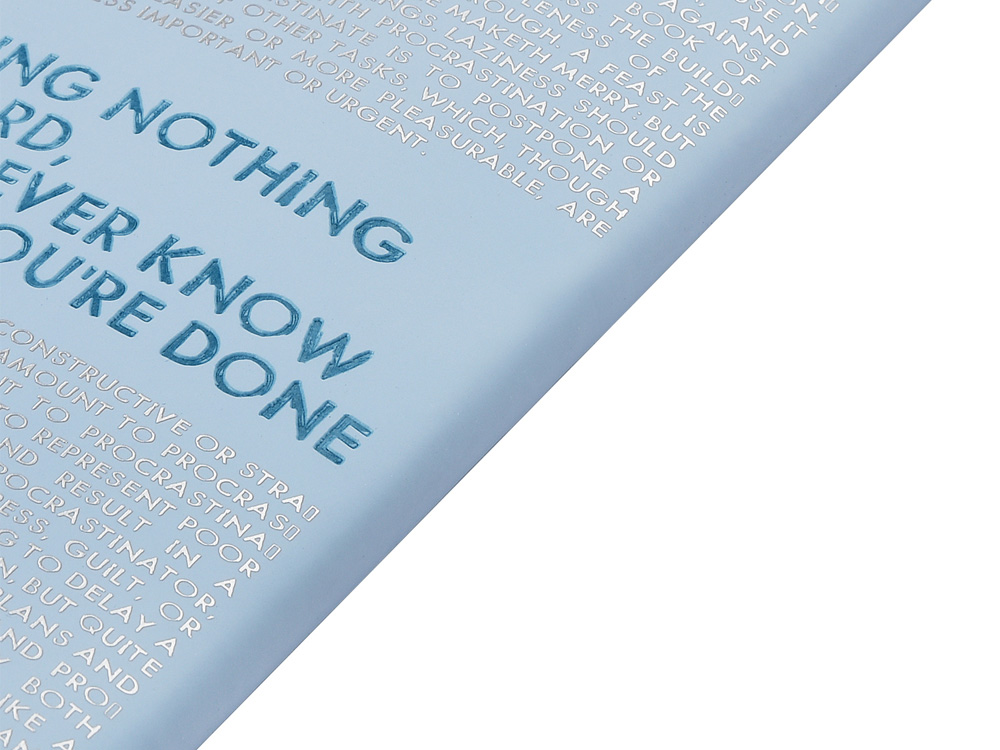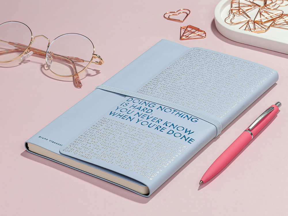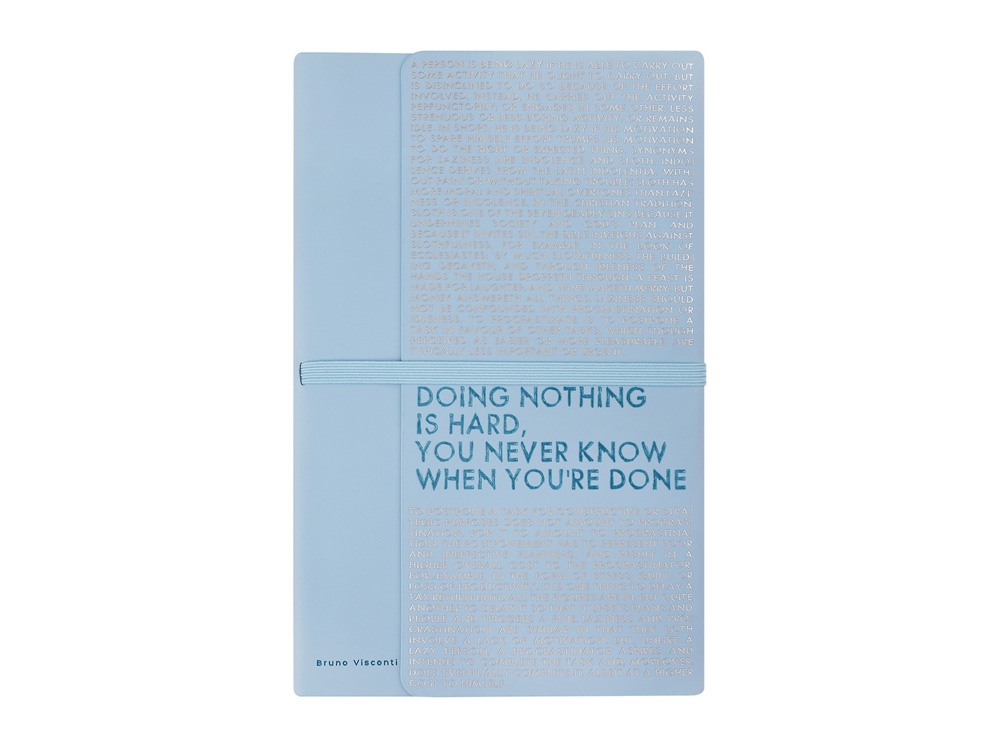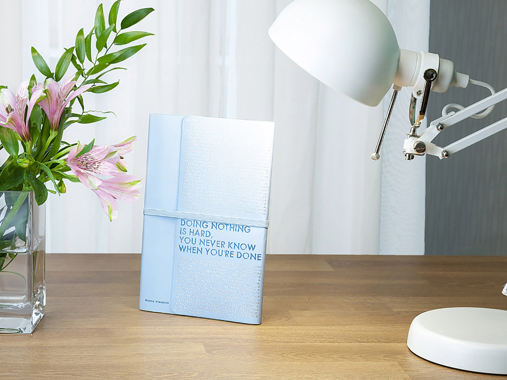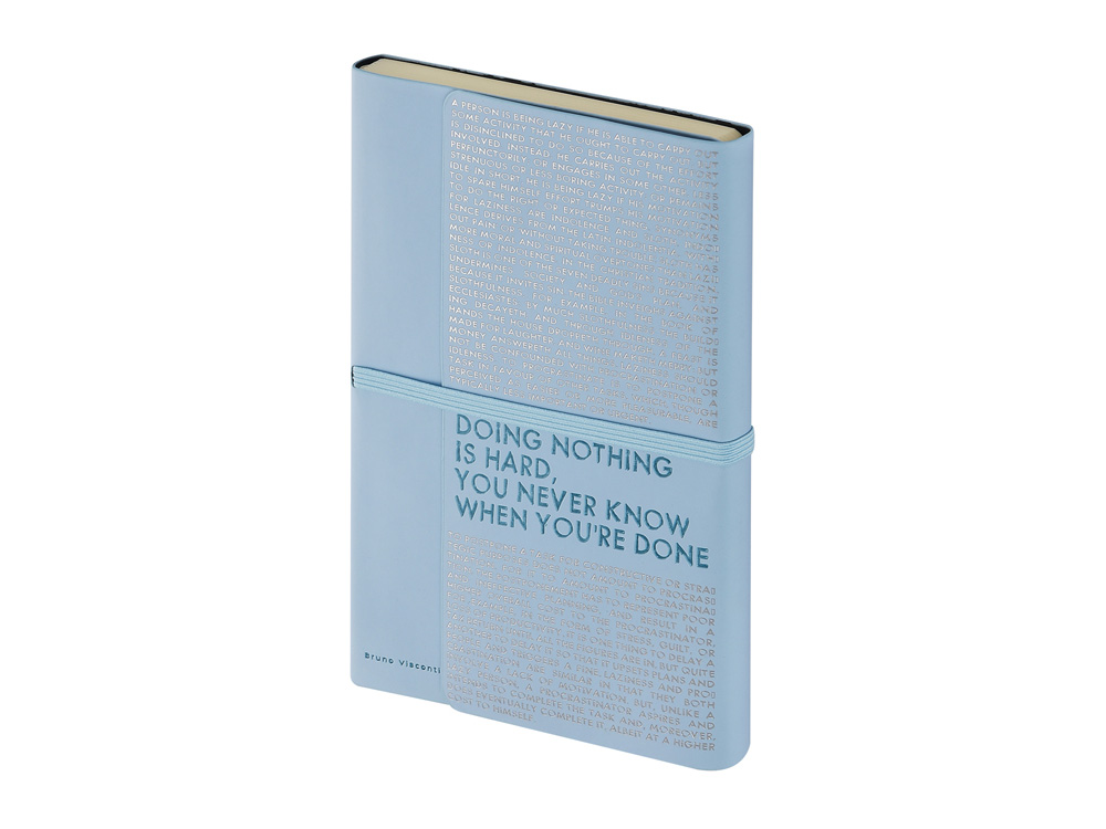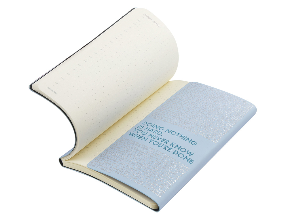 Так трудно ничего не делать, ведь совершенно непонятно, когда ты закончишь! Лаконичный слоган мотивирует к активным действиям. Планируй и завершай! Вот что кроется в элегантной надписи, выполненной золотым тиснением! А Flex обложка напоминает Будь гибким! Великолепный недатированный ежедневник Bilbao черно-синего цвета с тиснением фольгой. Бежевая бумага 65 г/м, широкая горизонтальная фиксирующая резинка. Гибкая обложка с покрытием Soft-touch. Особенность этого ежедневника - часть обложки внахлест может использоваться как закладка. Ежедневник упакован в картонный полукороб и термопленку.