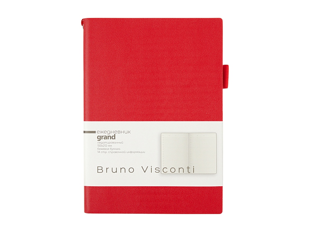 Мягкая, гибкая обложка с необычной фактурой, приятной на ощупь, петля под ручку, двойное ляссе, стандартный формат А5 — все это ежедневник Grand. А благодаря оригинальному способу фиксации ляссе на корешке ежедневник получил новое звучание. Такая фишка придется по вкусу всем, кто придает большое значение деталям. Недатированный блок изготовлен из бежевой бумаги плотностью 80 г/кв.м. Ежедневник имеет справочную информацию на 14 страницах.