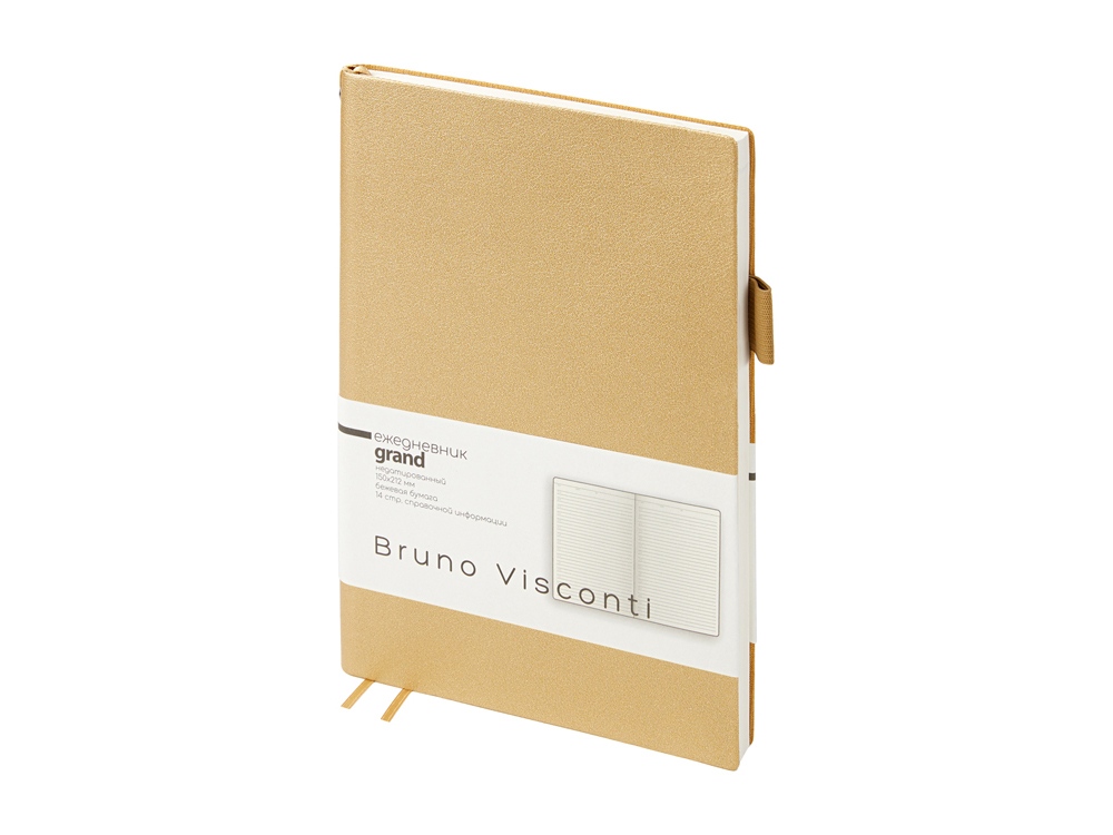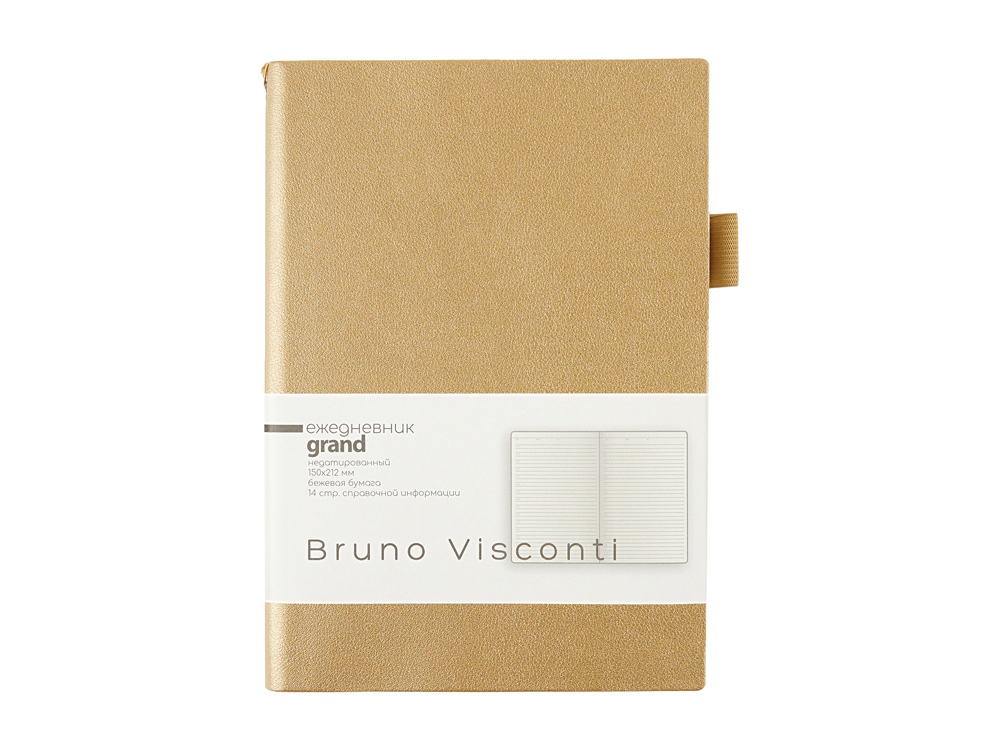 Мягкая, гибкая обложка с необычной фактурой, приятной на ощупь, петля под ручку, двойное ляссе, стандартный формат А5 — все это ежедневник Grand. А благодаря оригинальному способу фиксации ляссе на корешке ежедневник получил новое звучание. Такая фишка придется по вкусу всем, кто придает большое значение деталям. Недатированный блок изготовлен из бежевой бумаги плотностью 80 г/кв.м. Ежедневник имеет справочную информацию на 14 страницах.
