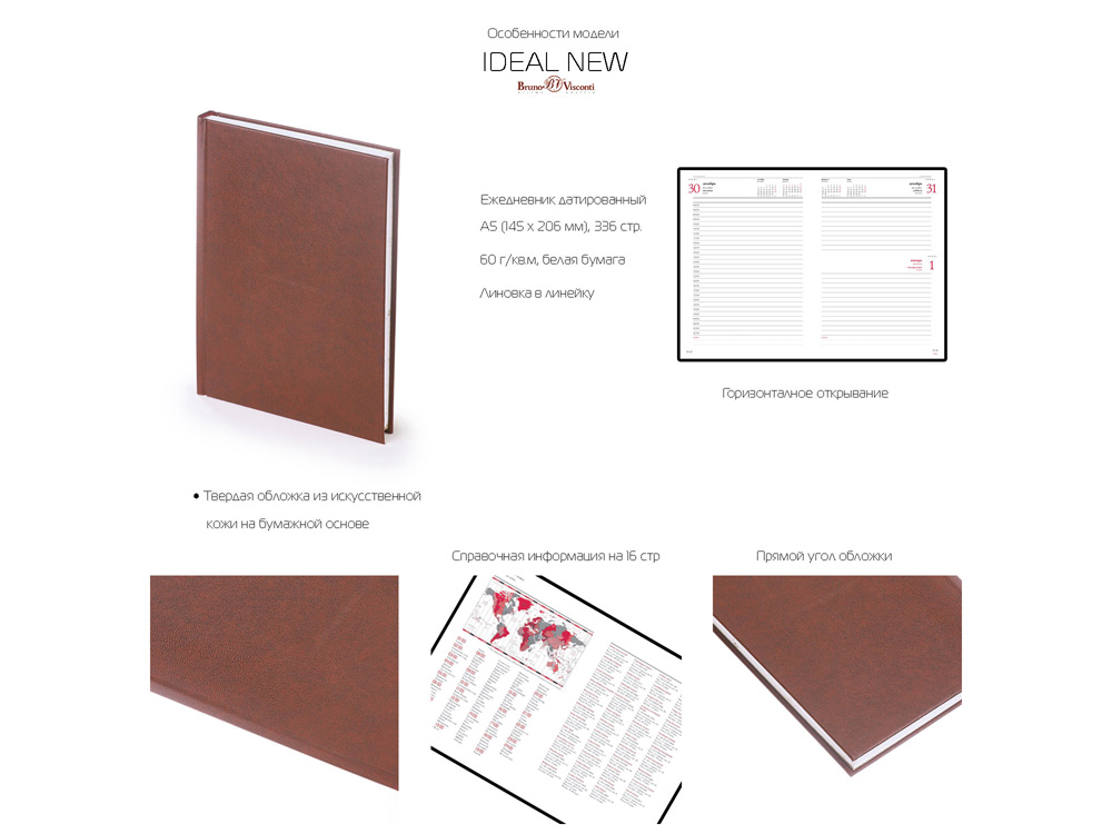 Недатированный ежедневник A5 Ideal New от бренда Альт - это качественный корпоративный подарок по выгодной цене, произведенный специально под персонализацию. Представлен в универсальном формате А5. Твердый переплет. Печать блока в 2 цвета. Обложка - итальянский переплетный материал на бумажной основе. В нем есть полезная справочная информация и телефонная книга, а также 272 страницы для записи идей, мыслей и составления рабочих планов. На каждой странице есть специальное место для написания текущей даты. Приведены сокращенные названия дней недели с понедельника до воскресенья. Для удобства использования этого ежедневника Вам лишь надо подчеркнуть нужный день недели. Две строчки на каждой странице отведены на ежедневное планирование. Есть почасовая разбивка страниц. Две последние строчки служат для комментариев. Строгий классический материал, прекрасная практичная альтернатива дорогостоящей натуральной коже. Идеально сочетается с тиснением фольгой. Ежедневник внесен в реестр российской промышленной продукции. Реестровый номер: 10733329, дата внесения 21.10.2025 Сертификат по форме СТ1 и выписку из реестра можно запросить у персонального менеджера.