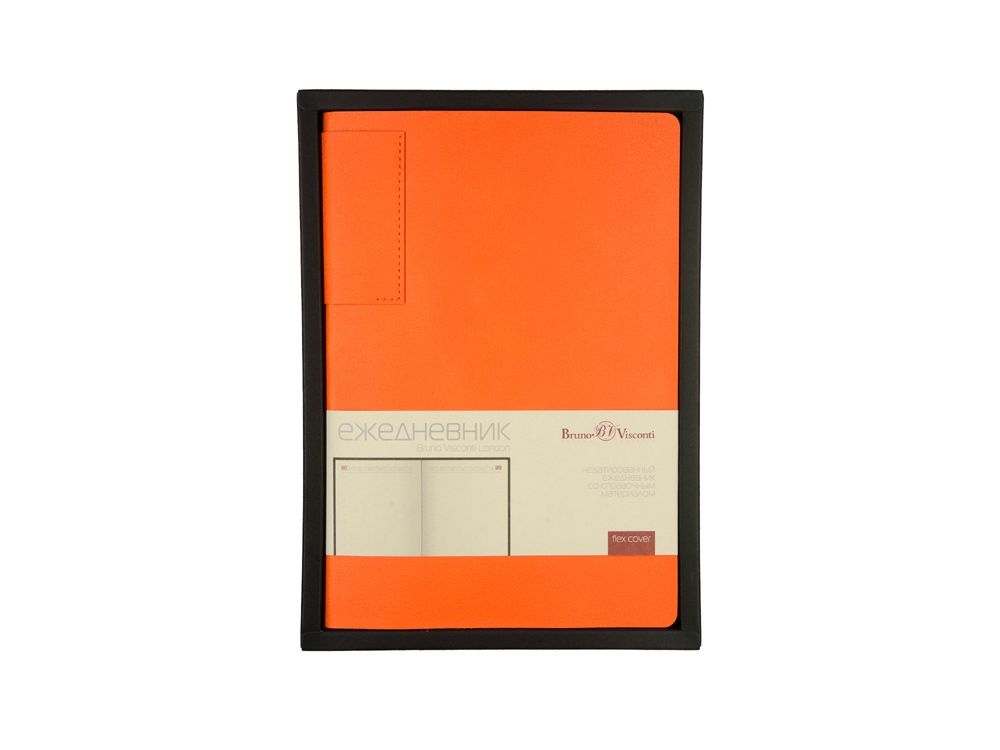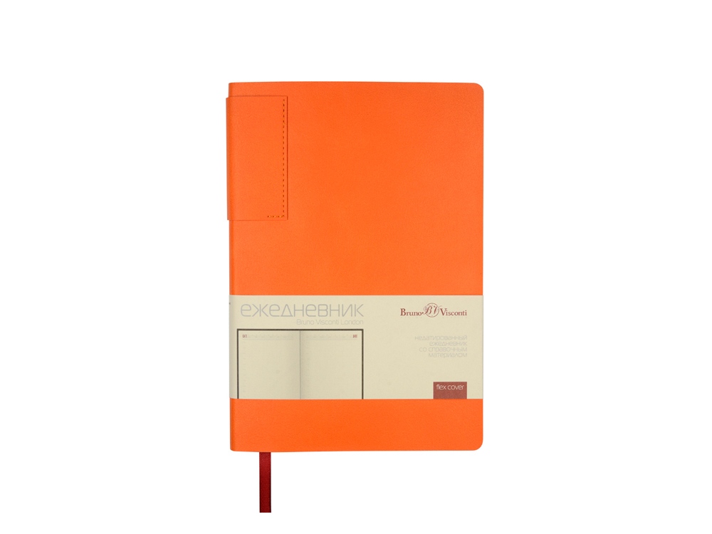 Классический ежедневник из коллекции London формата А5, недатированный. Лаконичная модель в ярком исполнении: гибкая обложка оранжевого цвета с контрастной или в цвет обложки нашивкой. Выполнен из качественной и прочной искусственной кожи, крепление внутреннего блока - книжный переплет, закладка- ляссе. Углы обложки скруглены. Внутри есть страница для личных данных, а также блок справочной информации (часовые пояса, аэропорты, телефонные коды, размеры одежды, автомобильные коды, римские цифры, расход калорий, формат бумаги, единицы измерения, штрихкоды, распад алкоголя в крови, города миллионники РФ и СНГ, национальные праздники, термины международной торговли, температура, скорость, давление, буквенные коды стран, энергетическая ценность продуктов, страны мира).