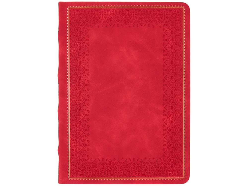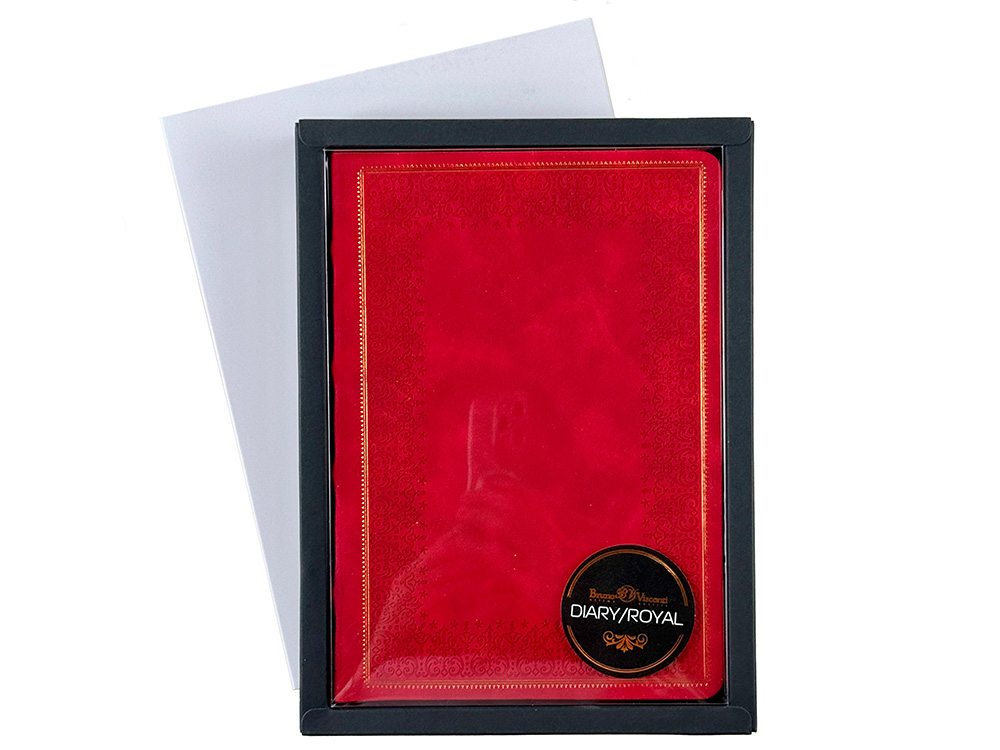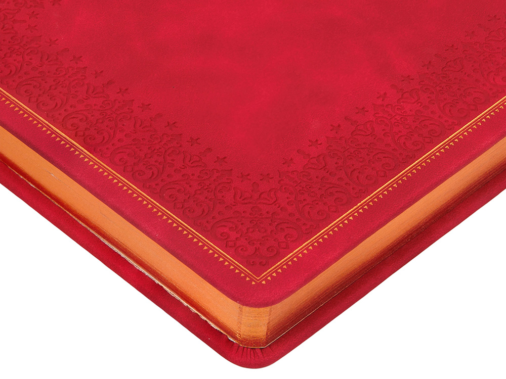 Недатированный ежедневник Royal формата А5 с твердой обложкой из искусственной кожи с имитацией нубука украшен художественным бронзовым и блинтовым тиснением. Внутри 256 страниц, выполненных из качественной бежевой бумаги в линейку плотностью 100 г/м². Два шелковых ляссе в цвет обреза блока и обложки облегчают навигацию по записям. Французский корешок дополнительно декорирован изящным бронзовым тиснением в виде виньеток. Скругленные углы обложки и блока подчеркивают стильный дизайн изделия, а блеск бронзового обреза дарит ежедневнику благородный и роскошный внешний вид.