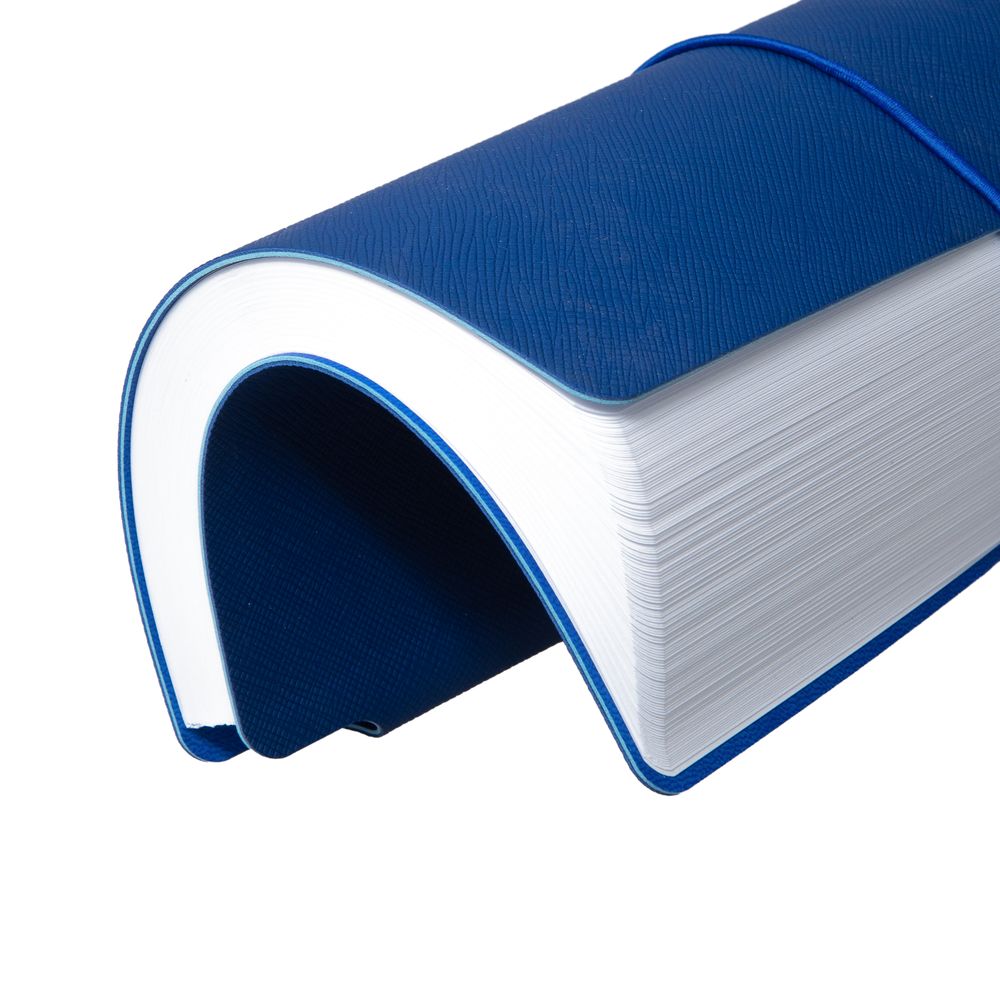 Ежедневник с гибкой обложкой выполнена из материала Nice Touch, синий и Latte, синий (внутренняя часть обложки), дополнен горизонтальной резинкой в цвет обложки. Внутри корешка — специальное место для крепления ручки размером до 15х1 см.