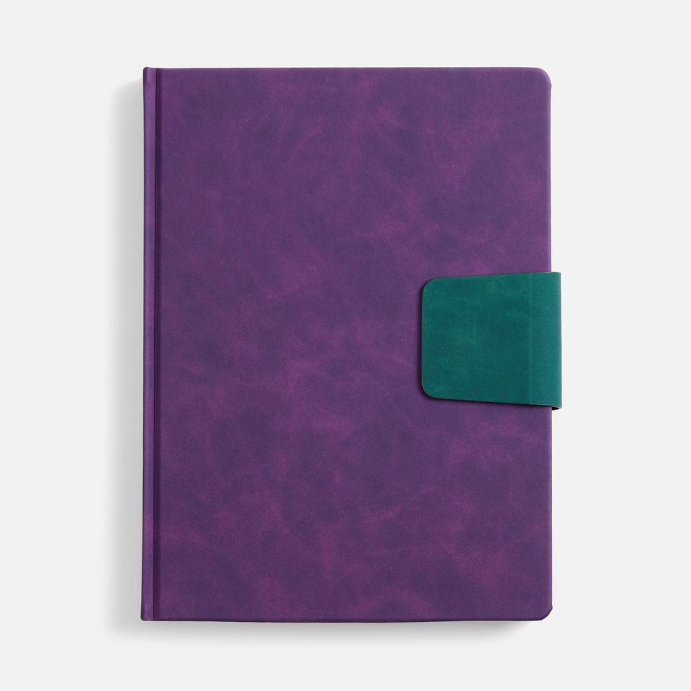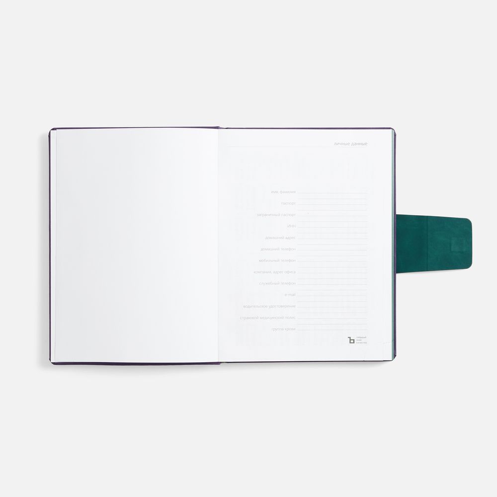 Ежедневник с твердой обложкой, выполнен из материала Nubuck Touch, фиолетовый UU, дополнен капталом, ляссе и обрезом синего цвета. Застежка — хлястик на магните из материала Nubuck Touch, темно-зеленый VV.