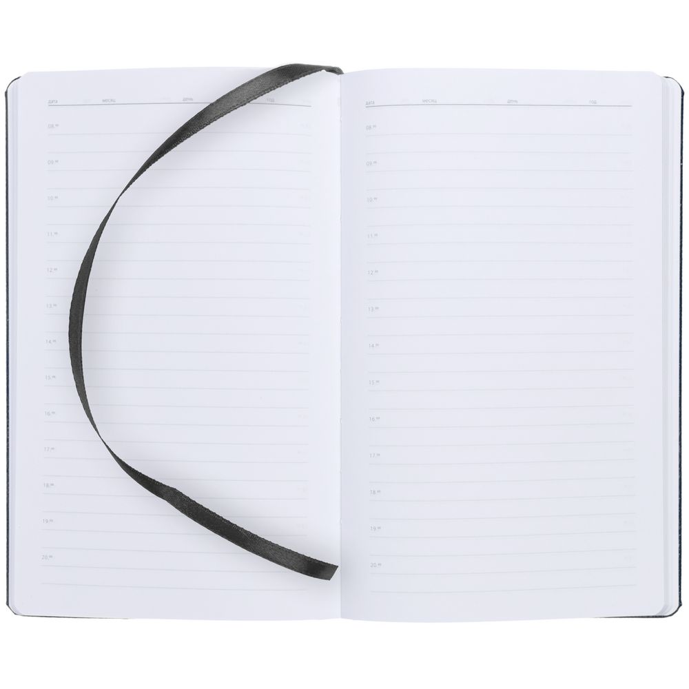 Ежедневник с твердой обложкой, выполнен из материала LaFite, черный АА, дополнен резинкой с металлическим круглым шильдом и ляссе в цвет обложки.