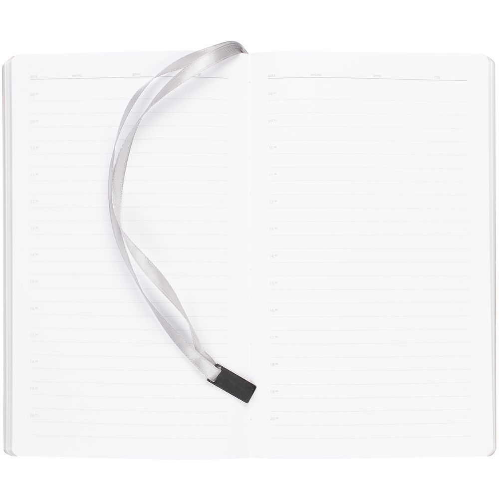 Ежедневник с гибкой обложкой, выполнен из материала Petrus, серый СС, дополнен серым ляссе с металлическим шильдиком.
