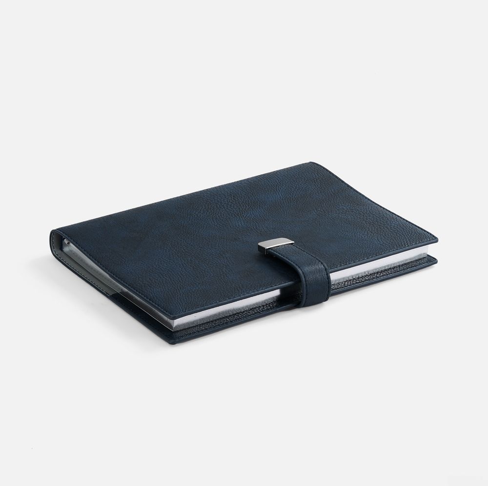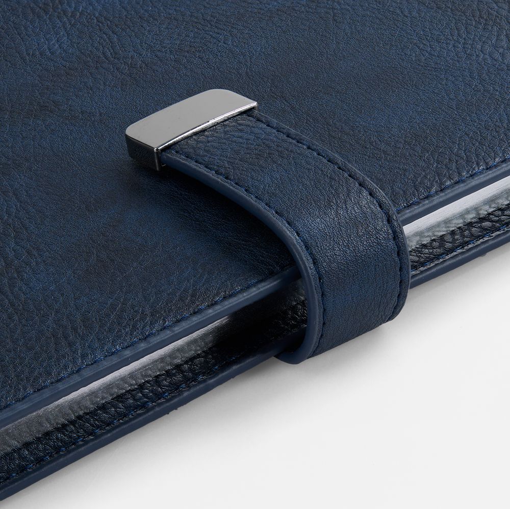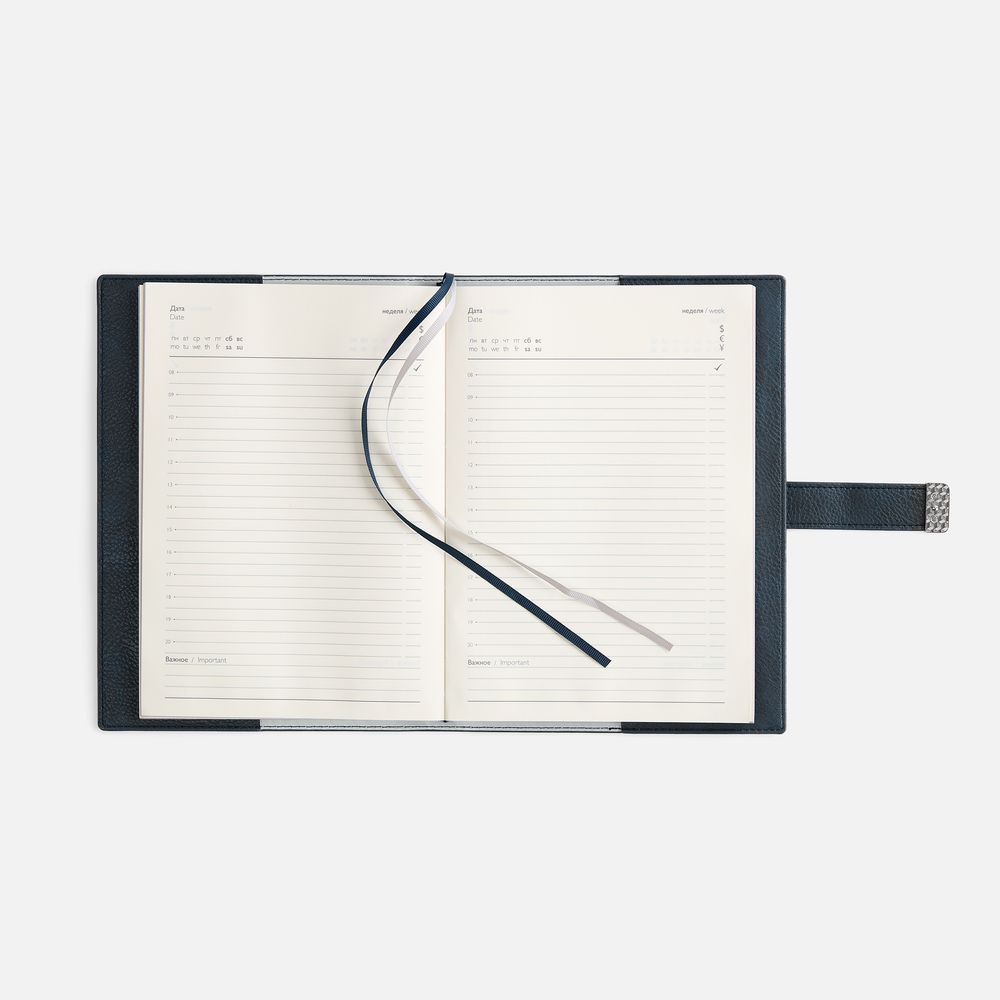 Ежедневник в мягком переплете со съёмная обложкой, дополнен застёжкой-хлястиком  с металлическим шильдом на кнопке, двойным ляссе и капталом.