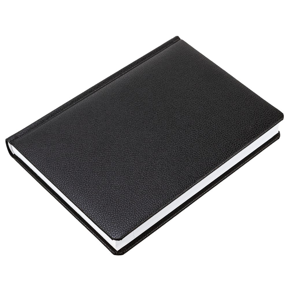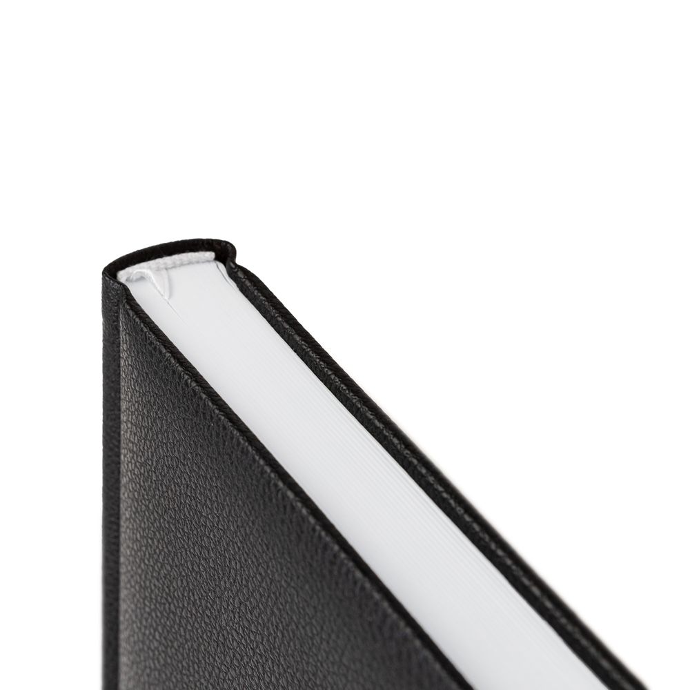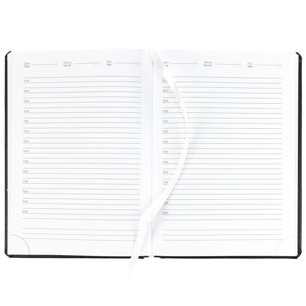 Ежедневник в твердой обложке c поролоном, выполнен из материала La Fite, черный АА, дополнен ляссе черного цвета и прошивкой по периметру обложки.