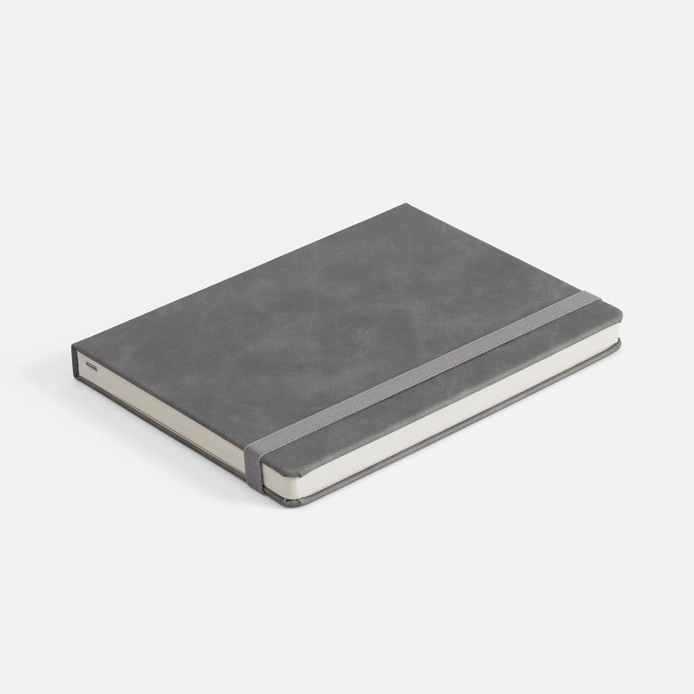 Ежедневник с твердой обложкой, выполнен из материала Nubuck Touch, серый СС, дополнен ляссе темно-серого цвета.