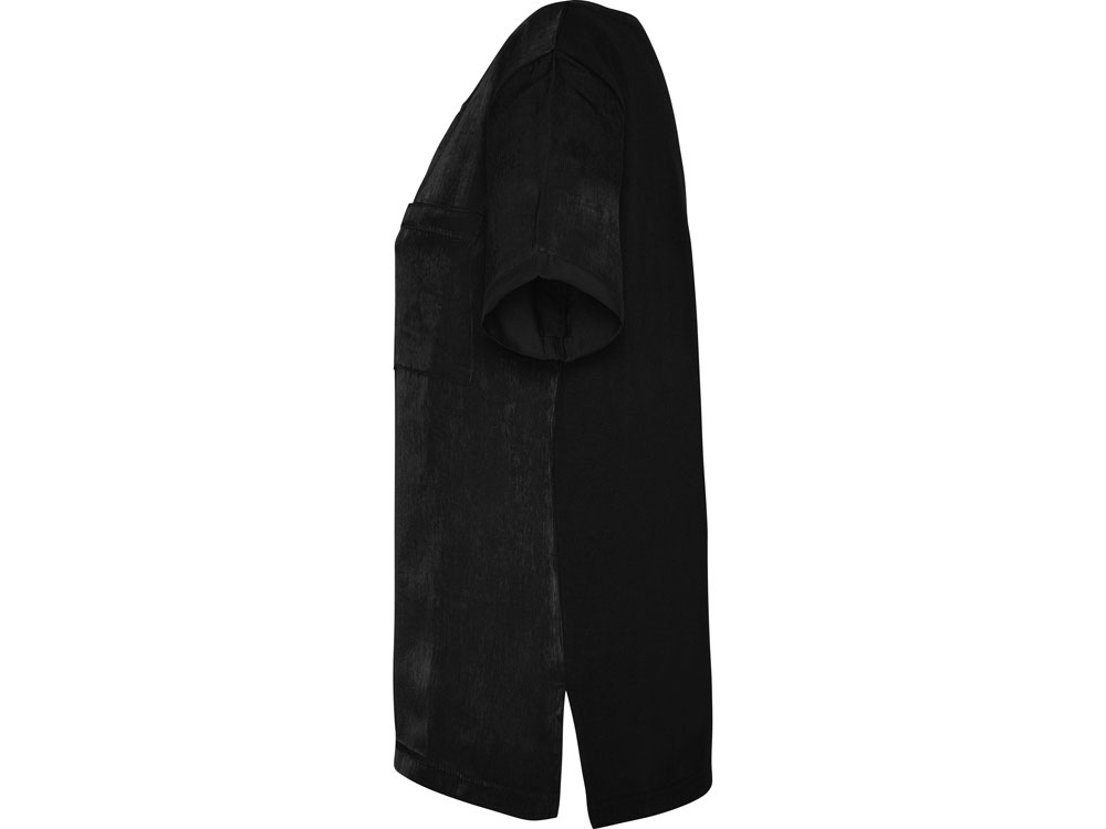 Женская футболка с коротким рукавом с расширенной горловиной. Накладной карман на груди слева. Спинка длиннее полочки. Разрезы в боковых швах.