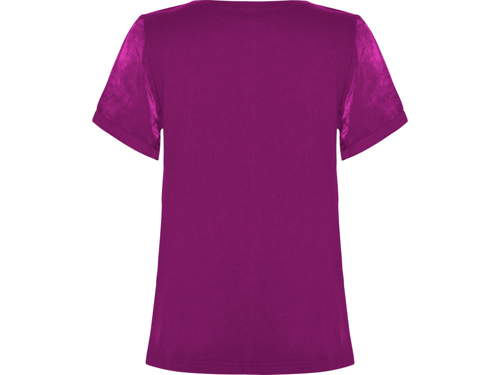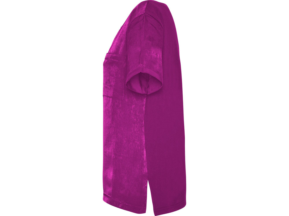 Женская футболка с коротким рукавом с расширенной горловиной. Накладной карман на груди слева. Спинка длиннее полочки. Разрезы в боковых швах.