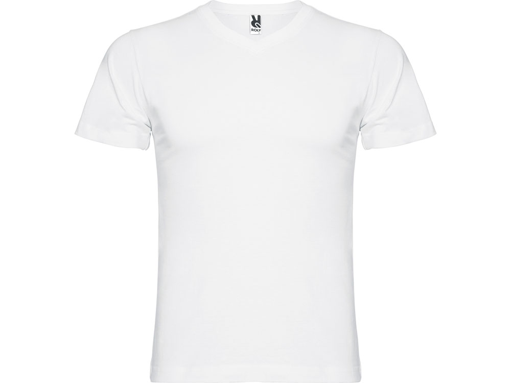 Мужская футболка без боковых швов с коротким рукавом и V-образным вырезом горловины, отделанном рибом 1х1. Горловина и плечевые швы дополнительно укреплены тесьмой.