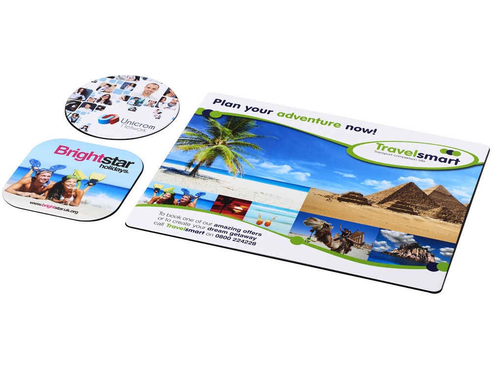 Комплект Brite-Mat® из коврика для мыши и подставки 1. Поставляется с ковриком для мыши Brite-Mat и набором соответствующих подставок. Набор состоит из прямоугольного коврика для мыши (0,3 x 19 x 21 см), квадратной подставки (0,3 х 9,5 х 9,5 см) и круглой подставки (0,3 x ø9,5 см). Ламинированная бумага и переработанная пластмасса.
