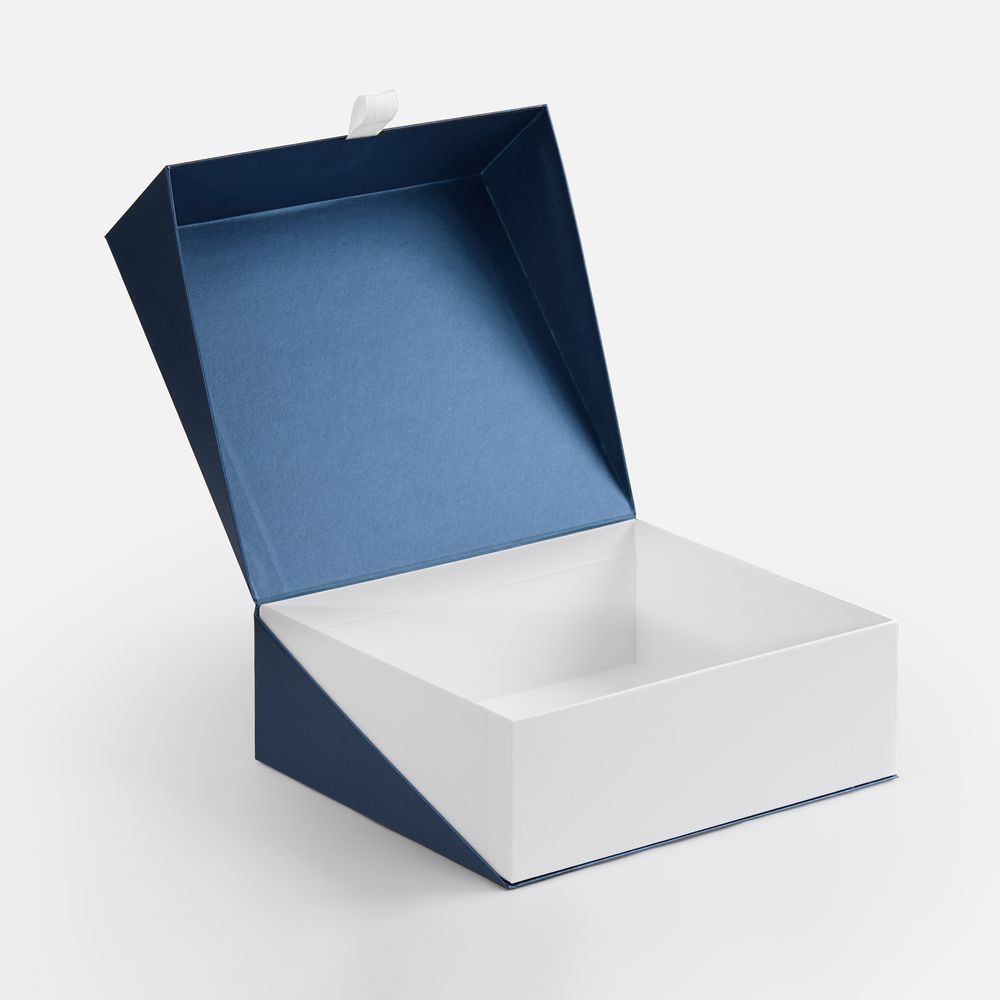 Коробка изготовлена из переплетного картона. Внутренний короб каширован мелованной бумагой с ламинацией, внешний корпус — лайнером из металлизированной бумаги Pearl Dream Blue, плотностью 135 г/м². Крышка фиксируется на магнит.