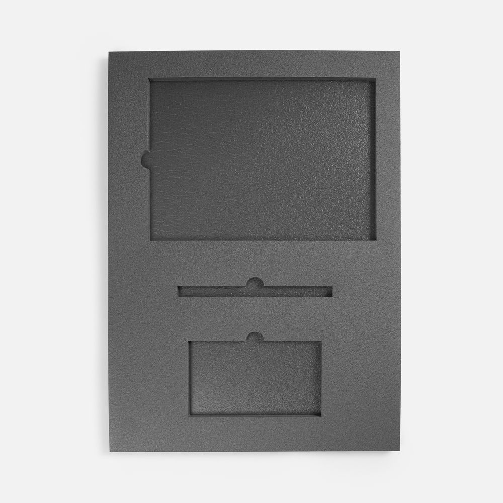 Ложемент, изготовленный из материала Izolon 500 черного цвета, представляет собой многослойную конструкцию, состоящую из нижнего слоя толщиной 5 мм и верхнего слоя толщиной 10 мм. В соответствии с утвержденным макетом, проемы для размещения предметов могут быть спроектированы как в одном, так и в обоих слоях.