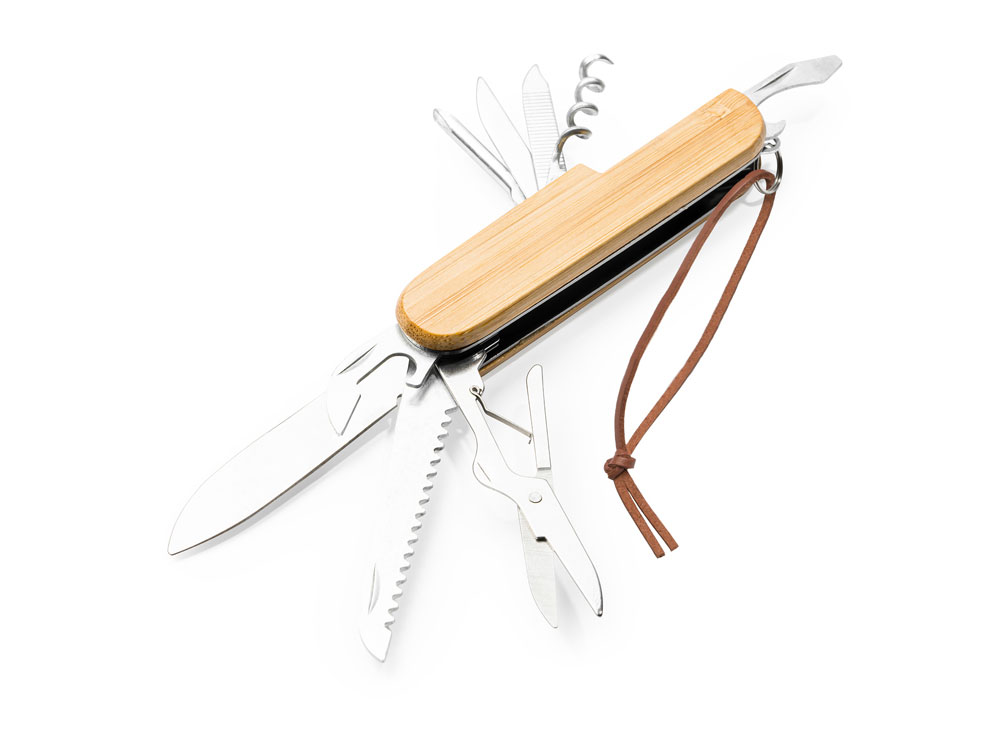 Мультифункциональный нож из нержавеющей стали и бамбуковым корпусом. 9 функций. В комплекте ремень для транспортировки из кожзаменителя.