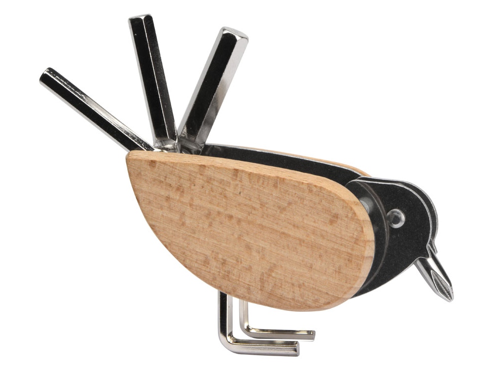 Очаровательный мультитул в виде птицы может показаться просто миленькой фигуркой, но пусть вас не смущает ее милый вид – на самом деле это многофункциональный инструмент 6-в-1! Клюв птички представляет собой крестовую отвертку из нержавеющей стали, ее ножки – это шестигранный шлиц на 3 и 2 мм, а хвостовые перья – шестигранники на 6, 5 и 4 мм, которые всегда готовы прийти вам на помощь. Бока птички – из букового дерева, их можно украсить логотипом при помощи гравировки, УФ-печати или тампопечати, чтобы украсить пернатое создание.