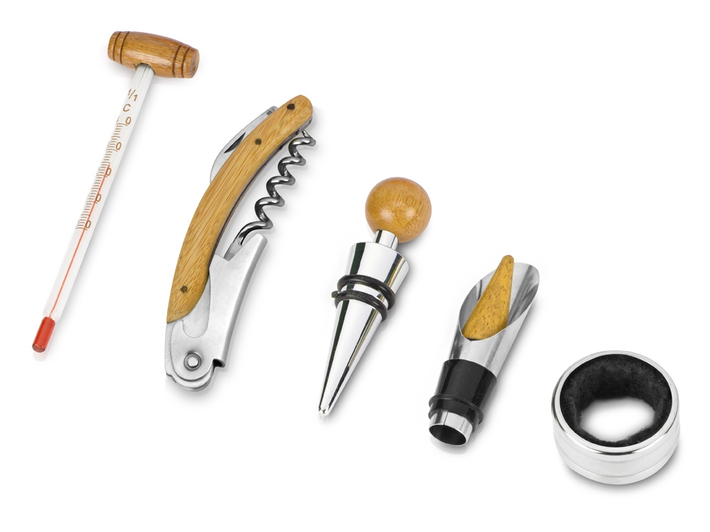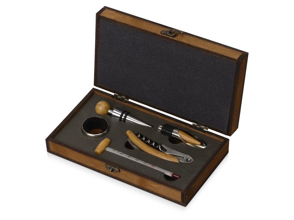 Роскошный набор аксессуаров для вина Кот-де-Сезан – отличный подарок для истинных ценителей. В комплект входят воротничок на бутылку, воронка-аэратор, пробка для бутылки, штопор-открывалка, термометр. Упакованы в красивый деревянный футляр. Отличный вариант имиджевой продукции для ресторанов, гостиниц и винных магазинов.