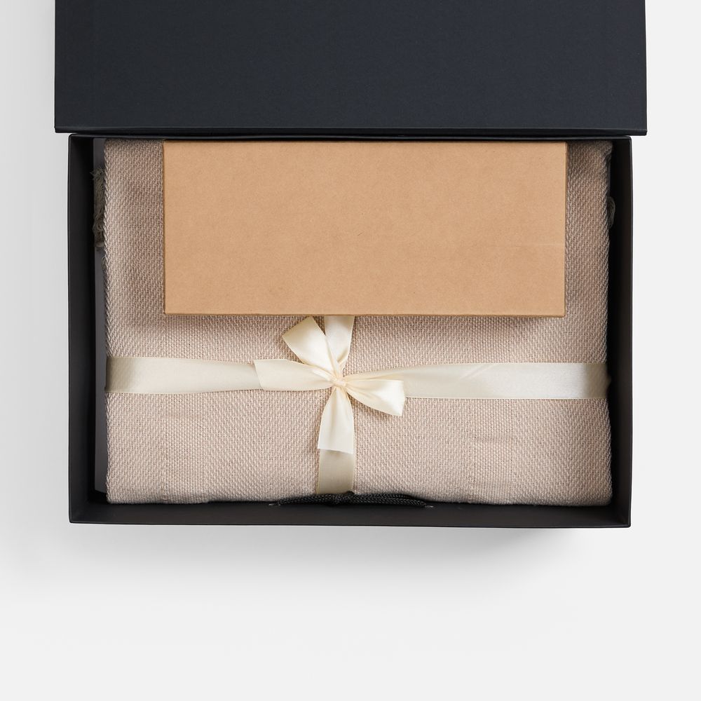 Материал флакон - стекло, палочки из файбера; подставка для флакона - дерево; плед - хлопок 95%, полиэстер 5%, плотность 300 г/м²; коробка - переплетный картон, бумага Malmero