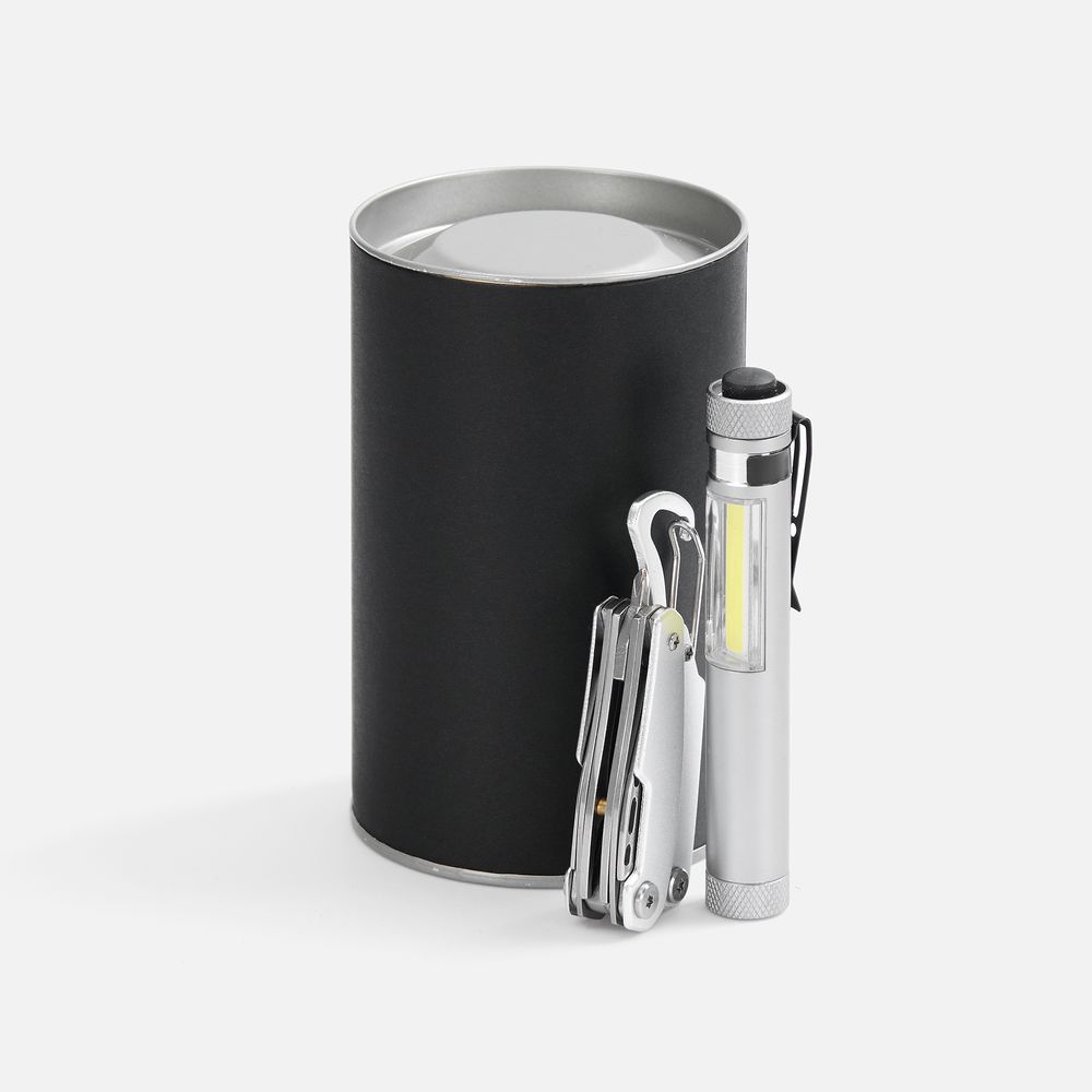 Миниатюрный, но незаменимый набор с мультитулом и фонариком в аккуратном тубусе.