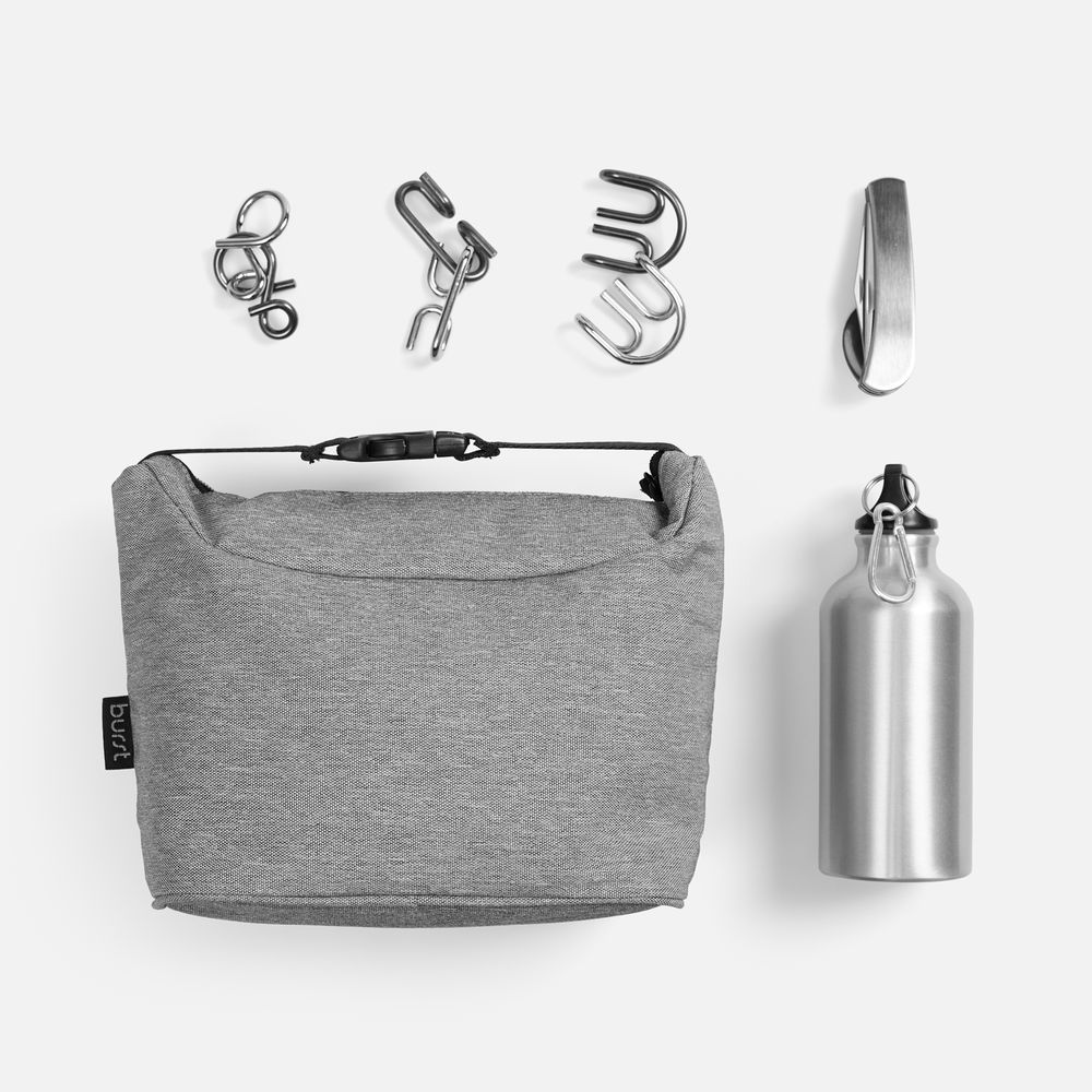 Материал термосумка - полиэстер, 600D, переработанный; столовый прибор - нержавеющая сталь; бутылка - алюминий; головоломки - металл, нержавеющая сталь; мешочек - хлопок