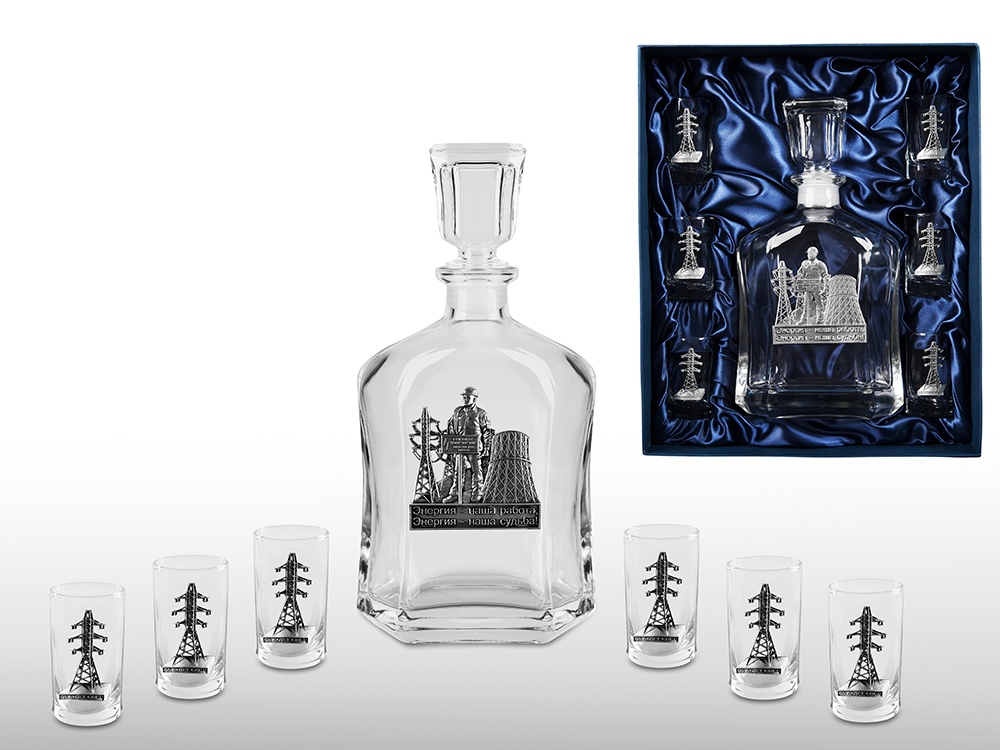 Подарочный набор со штофом Энергетики. Традиционная для русского человека комплектация: элегантный графин емкостью 700 мл. с оловянным барельефом ЭНЕРГЕТИК и 6 стопок емкостью 50 мл. с оловянным барельефом Опора ЛЭП. Материал барельефов: сплав с содержанием олова не менее 95%(пьютер). Художественное литье,чернение с эффектом антикварного серебра,полировка. Ручная работа. Подарочная упаковка люкс с атласным ложементом.