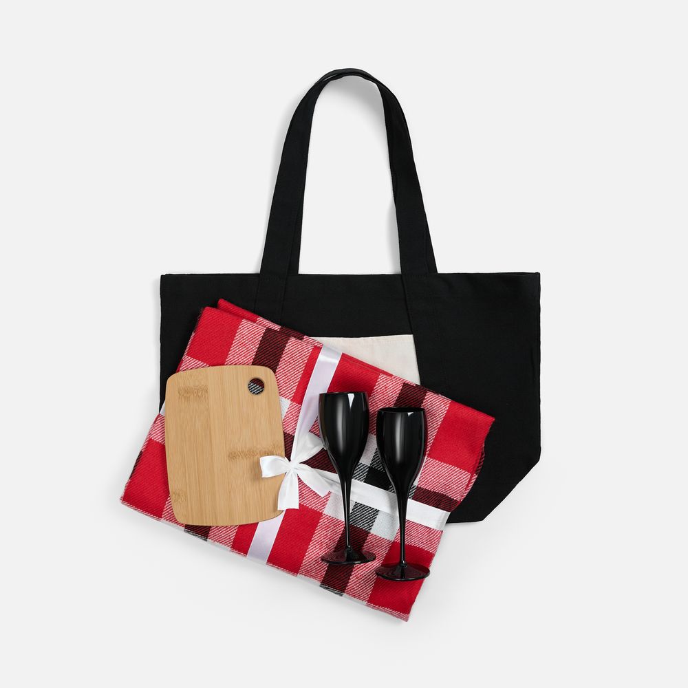 | Материал | плед - шерсть 15%; хлопок 5%; полиэстер 60%; акрил 20%, плотность 200 г/м²; шопер - полиэстер 60%, переработанный хлопок 40%, плотность 340 г/м²; бокалы - пластик; доска - бамбук |