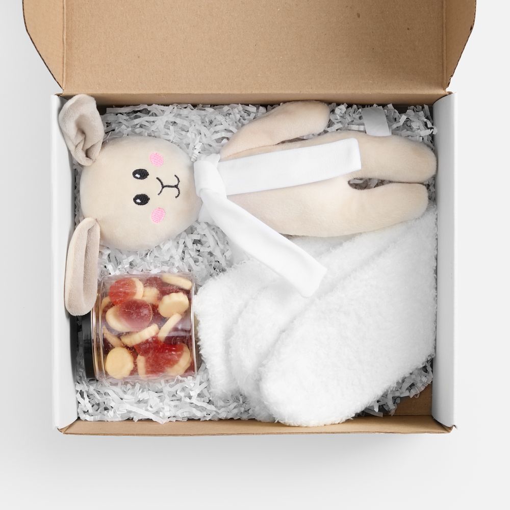 | Материал | коробка - микрогофрокартон; носки - полиэстер 100%; игрушка - велюр, полиэстер; упаковка мармелада - пластик |