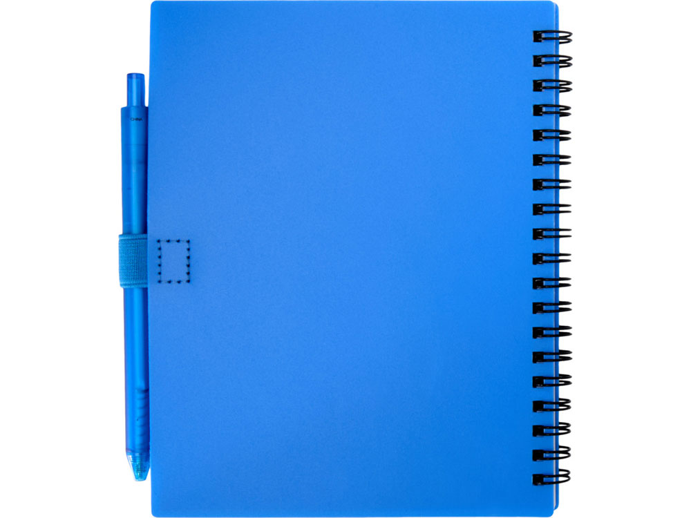 Блокнот Niove с мягкой обложкой изготовлен из переработанной пластмассы, имеет 70 нелинованных листов из бумаги плотностью 70 г/м². Блокнот имеет квадратные углы и петлю для ручки. Размер блокнота: 140 х 178 мм. Шариковая ручка также изготовлена из переработанной пластмассы. Цвет чернил: синий. Длина непрерывной линии: 1000 метров. Диаметр пишущего узла: 1,0 мм.