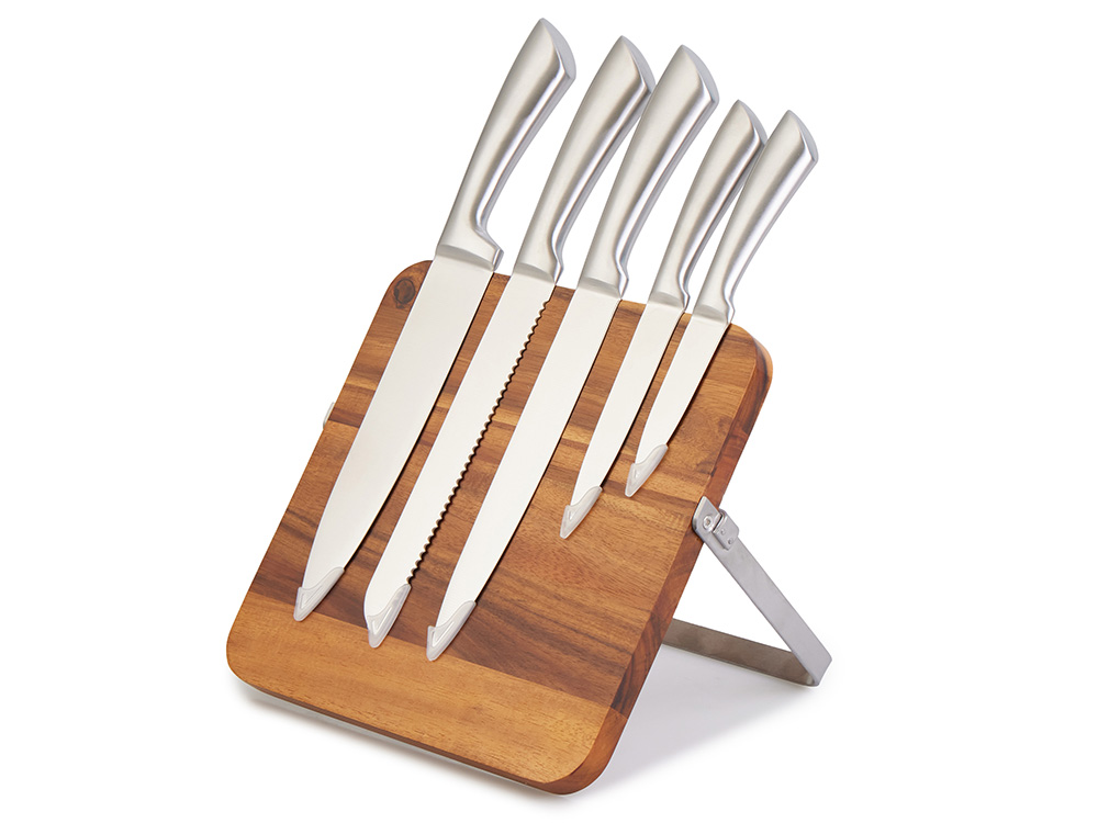 Набор ножей Терон на магнитной подставке из акации — это отличное решение для организации рабочего пространства на кухне. В комплекте пять ножей из нержавеющей стали и подставка, которая объединяет функциональность и природный стиль. Рукоятки ножей разработаны с учетом анатомии руки: они удобно лежат в ладони, не скользят и позволяют работать долго без чувства усталости. Встроенные в подставку магниты надежно удерживают ножи, при этом позволяют легко снять их одним движением. Натуральная древесина акации выглядит эстетично и премиально, поэтому подойдет под любой интерьер. Главное достоинство подставки из акации — высокая стойкость к влаге, она прослужит долго, стойко перенося влагу и механические нагрузки. Такая подставка обеспечит владельцу удобство на кухне, все ножи находятся всегда под рукой, что избавляет от необходимости искать нужный инструмент в ящике. - Удобное хранение ножей - Подходит для любого интерьера - Эргономичная рукоять ножей - Крепкая фиксация за счет магнитов В набор входят: магнитная подставка поварской нож (340 х 40 мм) универсальный нож (335 х 26 мм) нож для хлеба (335 х 30 мм) нож для овощей (230 х 20 мм) нож для овощей (200 х 20 мм)