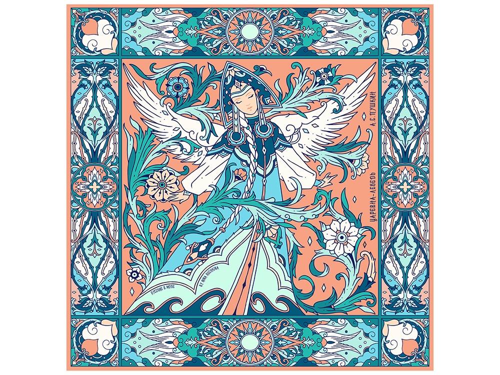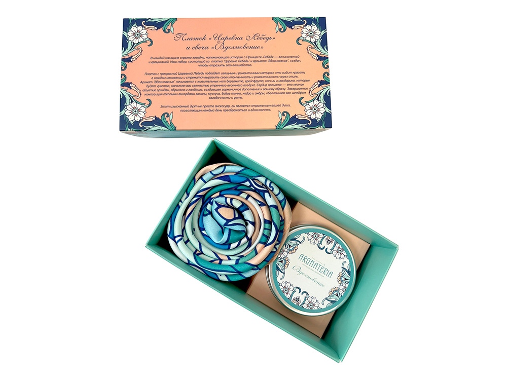 Комплект посвящен всем женщинам-музам, окрыляющим на свершения и открытия. Платок Царевна Лебедь создан по мотивам сказочно-фольклорного мира А.С. Пушкина, где прекрасная Царевна воплощает добродетель, мудрость и чарующую красоту. Перевоплощаясь в птицу, она способна достичь небывалых высот и озарить мир своим великолепием. Аромат свечи Вдохновение соткан из свежих нот цитрусовых и бергамота, пряных аккордов кассии и многоцветия орхидеи, ландыша, ванили. Дуэт станет эффектным акцентом праздничной атмосферы и непременно принесет воодушевляющие мгновения своей обладательнице!