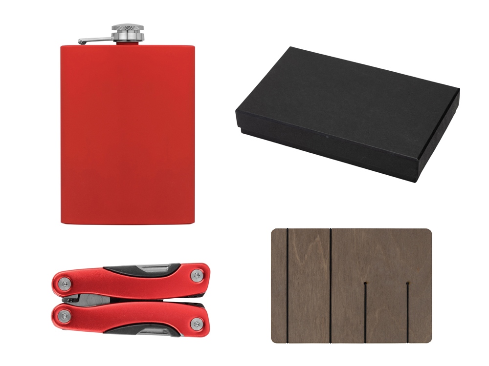 | Материал товара | ложемент - фанера, резинка, фляжка - нержавеющая cталь 304 марки с покрытием софт-тач, мультиинструмент - металл, полиэстер, коробка - картон |