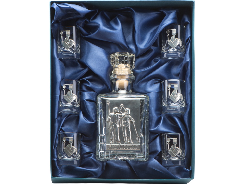 Для представителей настоящих мужских профессий и подарок должен быть соответствующий. Наш штоф, с набором рюмок, украшенный художественным литьем с эффектом антикварного серебра, является именно таким дорогим презентом. Подавать водку в графине всегда было правилом высшего общества. Алкогольный напиток предварительно очень сильно охлаждался, а после этого переливался в графин и, запотевший подавался на стол с рюмками. Набор для водки со штофом Металлургический - это отличный VIP-подарок для представителей металлургической отрасли. Подарок упакован в стильную подарочную упаковку, а сохранность набора гарантирует шелковый ложемент, который приятно оттеняет литье.