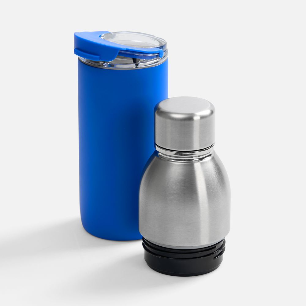 Varianti — это яркий пример посуды с двойной функциональностью. Один и тот же корпус можно превратить как в термостакан для чая и кофе с пластиковой крышкой, так и в термобутылку для прохладительных напитков со стальной крышкой.