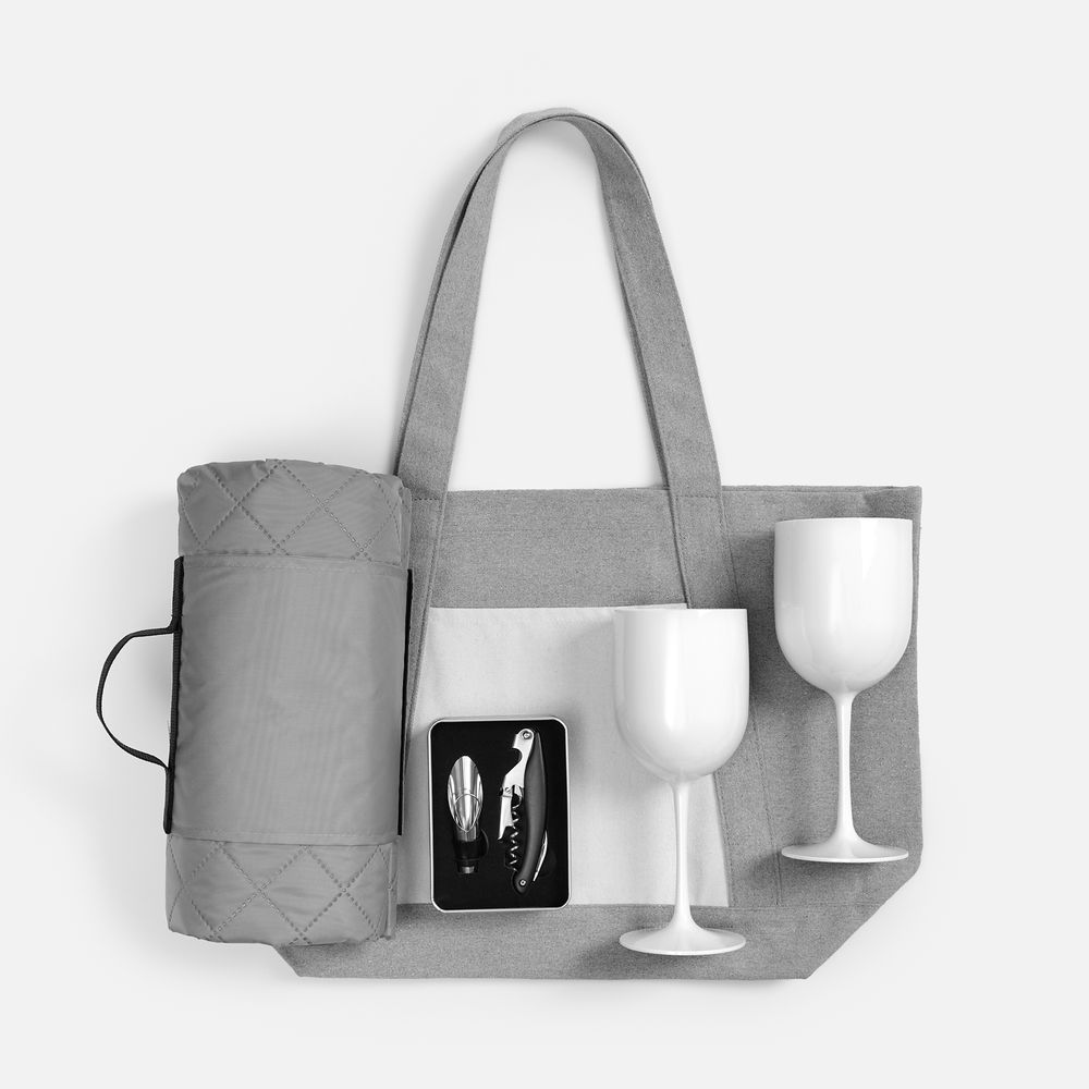 | Материал | плед - флис, плотность 220 г/м²; полиэстер; шопер - полиэстер 60%, переработанный хлопок 40%, плотность 340 г/м²; набор для вина - нержавеющая сталь, пластик; бокалы - пластик |