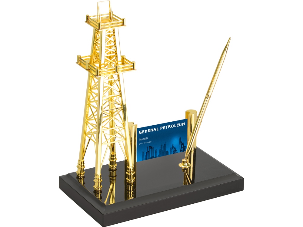 Настольный прибор с вышкой прекрасно подчеркнет специфику работы ресурсодобывающей компании. На приборе расположена визитница и подставка для шариковой ручки. Классическое сочетание черного и золотистого оттенков хорошо впишутся в интерьер.