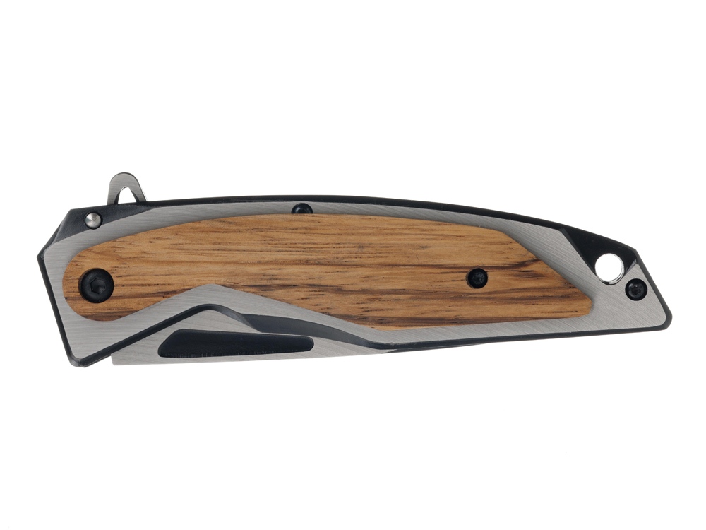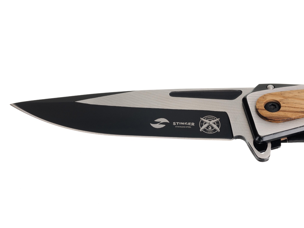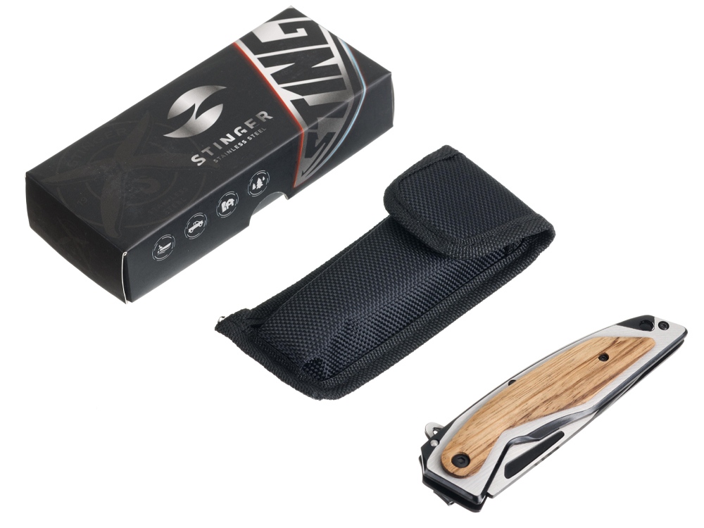 НОЖ СКЛАДНОЙ STINGER Повседневный нож для широкого спектра задач. Легкий и неприхотливый в обслуживании. Рукоять ножа произведена из нержавеющей стали с накладками из древесины, собрана на втулках - бонках, поэтому при необходимости нож можно легко промыть. Нож быстро открывается при помощи флиппера с ассистом (механизм ускоренного открывания). На рукояти расположено отверстие для темляка и клипса для удобного размещения ножа в кармане. Клинок ножа произведен из жаропрочной мартенситной стали 3Cr13. Преимуществом этой стали является отличное противодействие коррозии благодаря высокому содержанию хрома (13%). Оптимальное содержание легирующих элементов в составе сплава 3Cr13 придает ему хорошую твердость в диапазоне 52-55 HRC. Из-за низкого содержания углерода (0,3%) заточку лезвие из такой сталь держит средне, но легко затачивается даже после активной эксплуатации ножа. При этом дополнительных аксессуаров для заточки не требуется, достаточно простого точильного камня или мусата. Характеристики: Материал клинка: нержавеющая сталь 3CR13 Твердость по шкале Роквелла: 52-55 HRC Материал рукояти: нержавеющая сталь/древесина зебрано Метод открывания клинка: флиппер с ассистом (механизм ускоренного открывания) Фиксатор клинка: Liner Lock Длина ножа: 215 мм Длина клинка: 95 мм Толщина клинка: 3 мм Вес: 146 г. Цвет рукояти: коричневый/серебристый Особенности: рукоять с клипом и отверстием под темляк В комплекте: нейлоновый чехол