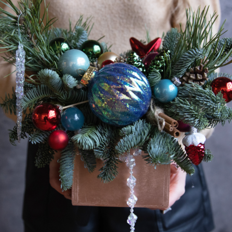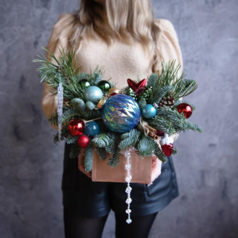 | Состав | веточки нобилиса и можжевельника, елочные игрушки, шишки, декор. |