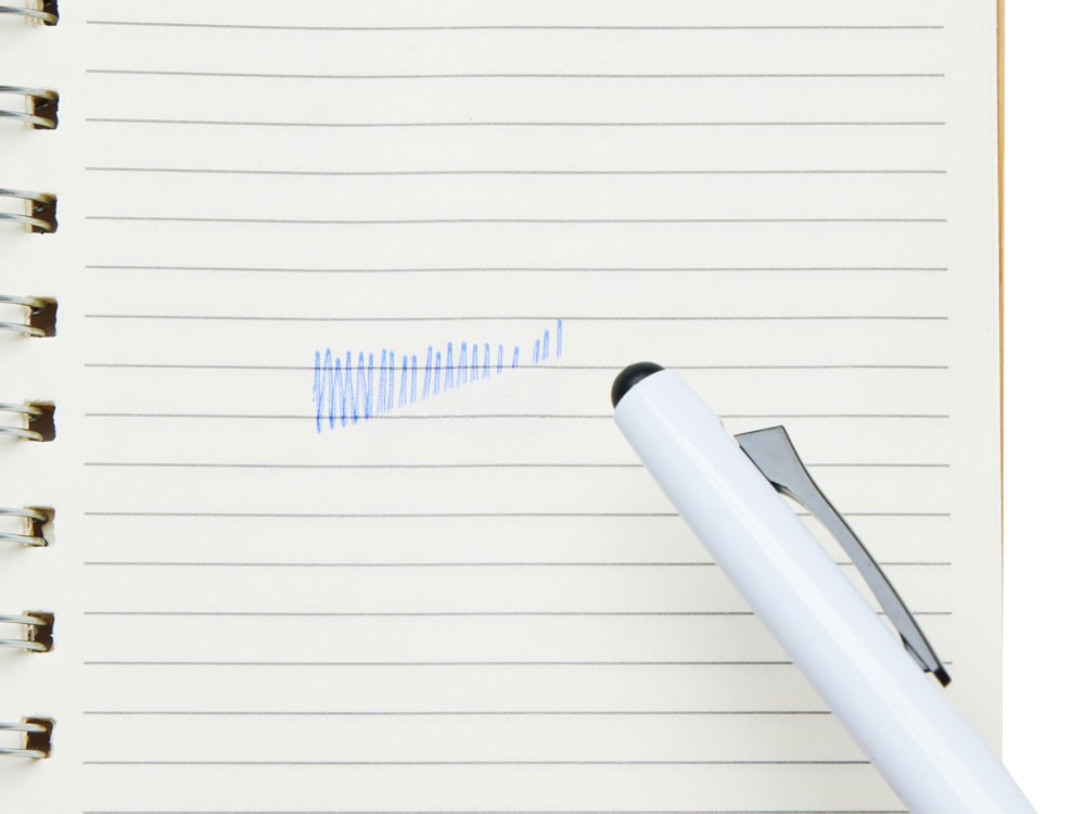 Пластиковая шариковая ручка со стирающимися чернилами. Синие чернила стираются с помощью ластика в верхней части ручки.