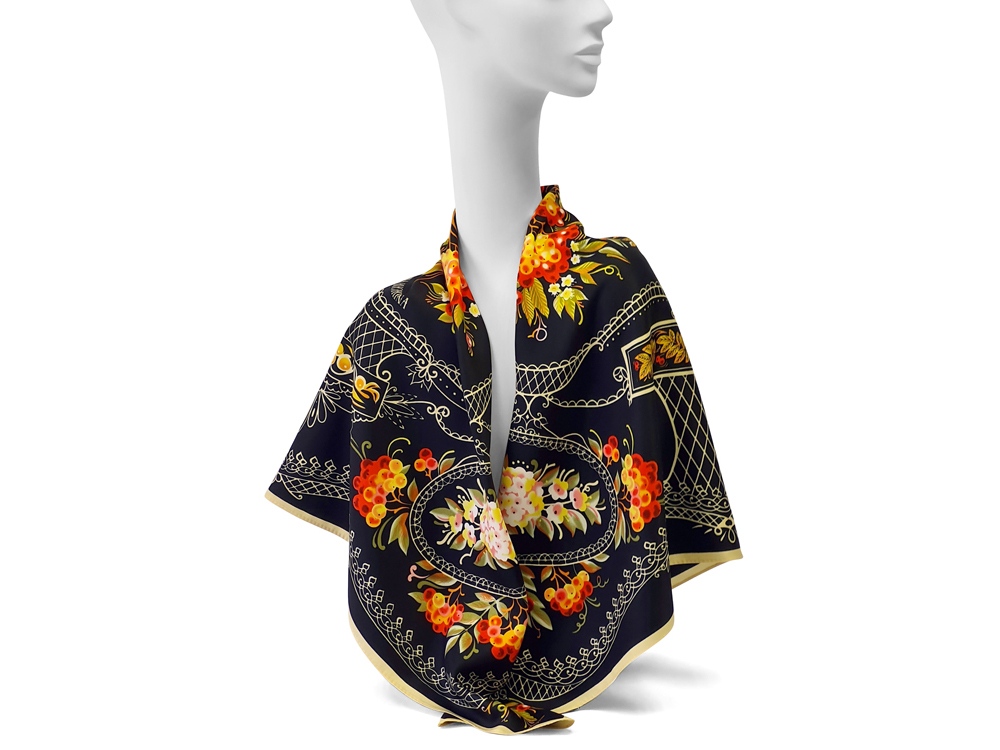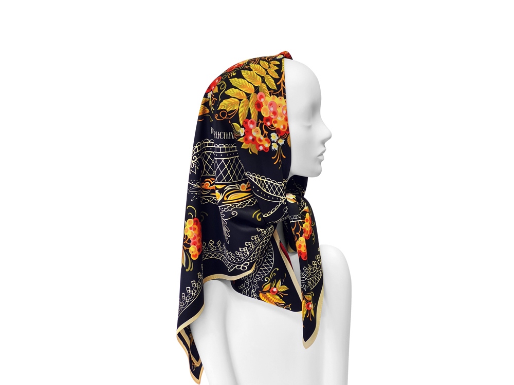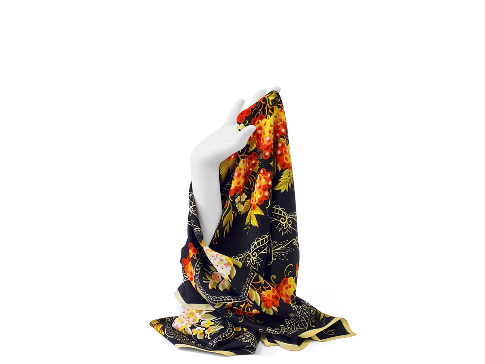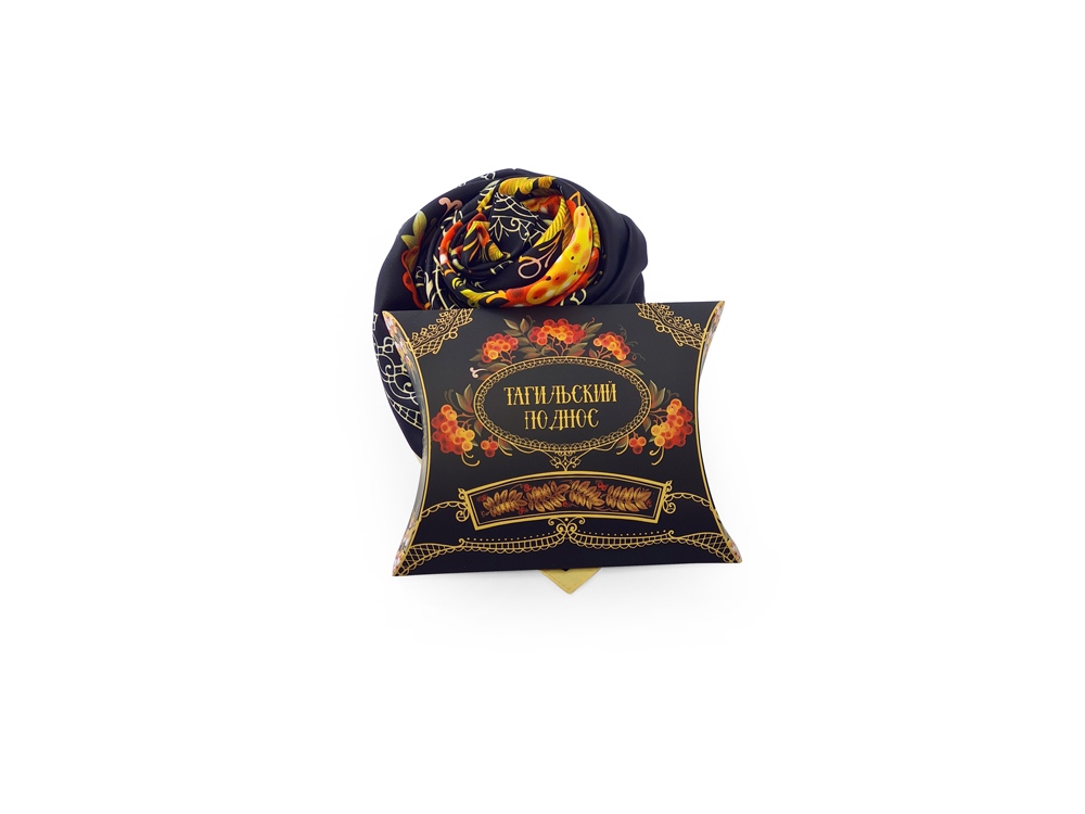 Нижний Тагил - крупнейший промышленный центр Урала, является родиной русского расписного железного подноса. Искусство уральской лаковой росписи, зародившееся в 40-е годы XVIII столетия и активно развивающееся в XXI, обогатило художественную культуру России. В нем воплотился сплав высокого профессионального мастерства, кропотливого труда художников по металлу, стремление к прекрасному и талант народных живописцев. Русская рябина - излюбленный сюжет мастеров тагильского подноса. Она абсолютно уникальна и узнаваема. Эскиз платка дополнят утонченная вязь орнаментов и ажурные решетки, присущие исключительно этому промыслу. Платок Тагильский поднос станет ярким акцентом в вашем гардеробе. Насыщенная терракотово-чёрная цветовая гамма плодов всегда актуальна, а нежные оттенки цветов рябины внесут настроение романтичности и легкости.