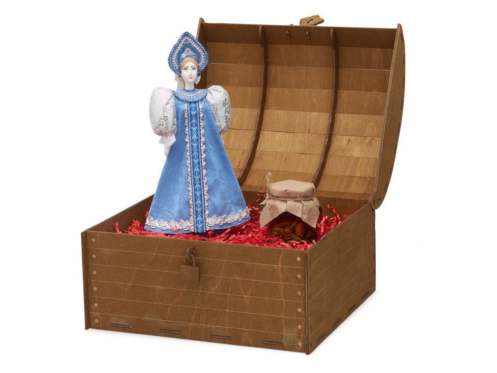 Подарочный набор словно сошёл со страниц русской сказки: в нём гармонично переплелись изящество ручной работы и щедрость родной природы. Каждый элемент продуман до мелочей, чтобы создать неповторимую атмосферу тепла и исконно русского гостеприимства. Комплектация: 1. Фарфоровая кукла в народном костюме ручной работы: Яркий расшитый сарафан и традиционный кокошник с изящной вышивкой. 2. Натуральный мёд с грецким орехм (250 г): Отборный цветочный мёд с грецким орехом. Упакован в стеклянную баночку с винтовой крышкой. 3. Декор из бумажной стружки придаёт композиции глубину и благородство, бережно сохраняя все элементы набора. 4. Деревянный сундук с изящным замочком превращает вручение подарка в особый ритуал. Дополнительное брендирование шильдом спектрум делает презент эксклюзивным и памятным. Для ценителей аутентичных сувениров и изысканных вкусов.