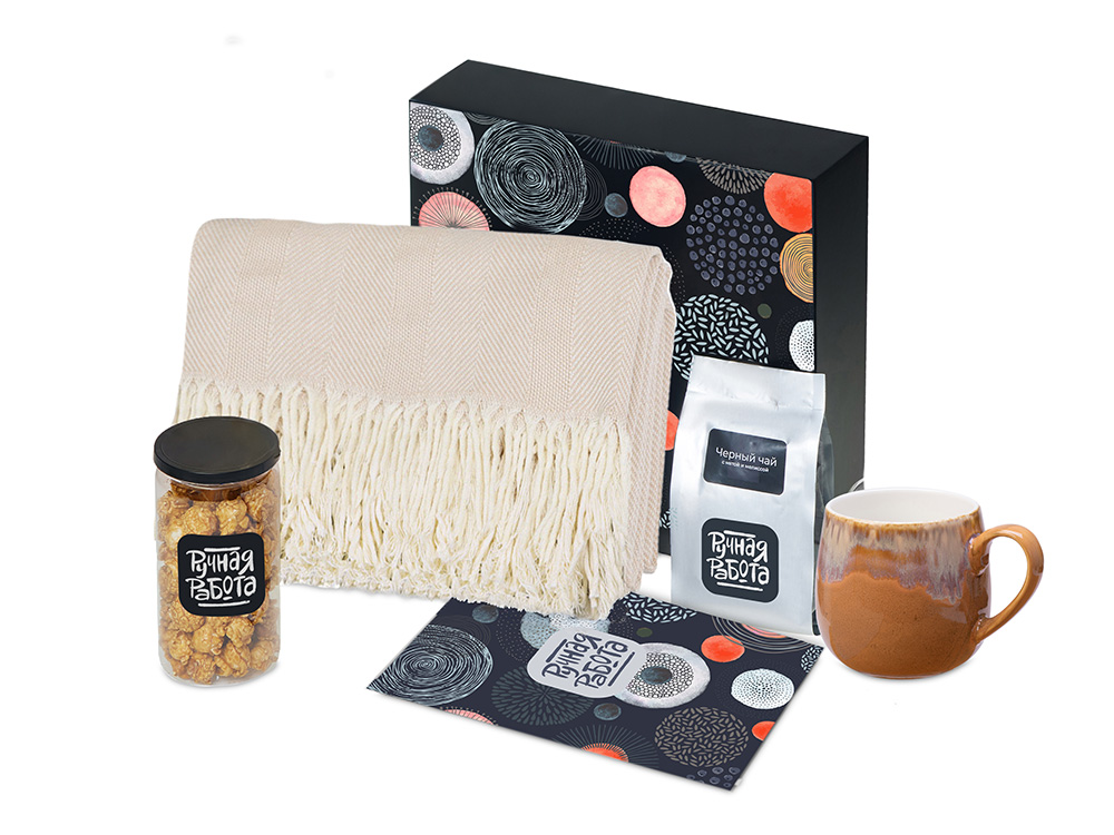 | Материал товара | плед - 100% хлопок, кружка - костяной фарфор с покрытием софт-тач, чай - пластик, попкорн - пластик, металл, мешок - нетканый материал (спанбонд), коробка - картон |