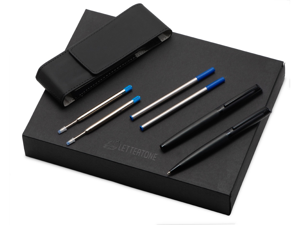 Если вы ищете премиальный и статусный подарок, то этот подарочный набор от бренда Lettertone для вас! Качество видно в каждом элементе. В набор входят шариковая ручка и роллер. Швейцарский пишущий узел Premec и немецкие чернила Dokumental обеспечивают мягкое и плавное письмо. Корпус каждой ручки имеет анодированный слой, благодаря которому гравировка получается с зеркальным эффектом.В набор входит также пенал для двух ручек, который также можно брендировать. - по 2 запасных стержня для каждой ручки в комплекте; - цвет чернил: синий; - набор упакован в подарочную коробку.